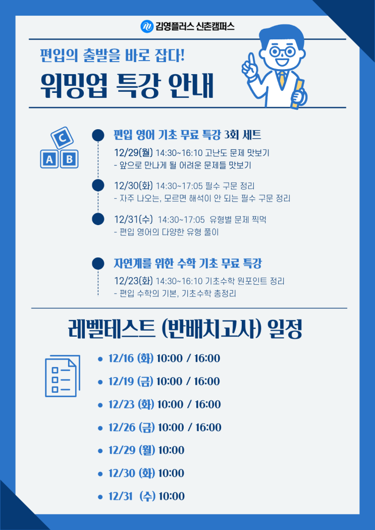 안녕하세요. 김영편입 신촌 플러스 + 김영플러스 신촌캠퍼스입니다. 편입을 처음 준비하는 학생들이 가장 궁금해하는 건 “어디서부터 어떻게 시작해야 할까?” 하는 부분이죠. 신촌캠퍼스에서는 12월 한 달 동안 영어·수학 기초 무료 특강 + 레벨테스트(반배치고사) 를 통해 편입 준비의 출발을 정확하게 잡을 수 있도록 돕고 있습니다. 편입 영어 기초 무료 특강 초시생도 부담 없이 들을 수 있는 기초 다지기 3회 특강입니다. ✔ 12/29(월) 14:30~16:10 고난도 문제 맛보기 – 편입 영어가 실제로 어느 정도 난도인지 미리 체감하는 시간 ✔ 12/30(화) 14:30~17:05 필수 구문 정리 – 반복 출제되는 구문 중심으로 해석의 기본 틀 잡기 ✔....... <img src="https://blogthumb.pstatic.net/MjAyNTEyMDlfMTMy/MDAxNzY1MjY3NjU4MDgz.ISh4cziryyUP4OpqnC8c6fwR-_gnqmrDvGWKamQ5TBkg.fSJ09FE6Vj1qdBnJFb5zqAcLDu99JfnLlmDU6jEc85Qg.PNG/%BF%F6%B9%D6%BE%F7%2C_%B7%B9%BA%A7%C5%D7%BD%BA%C6%AE-%BB%F3%B4%E3%BD%C7%BF%EB.png?type=s3" />