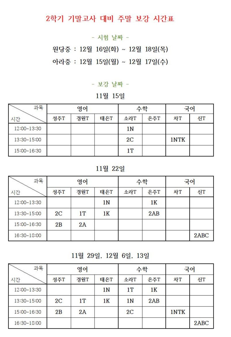 원당중 2학기 기말고사 대비 주말 보충 시간표