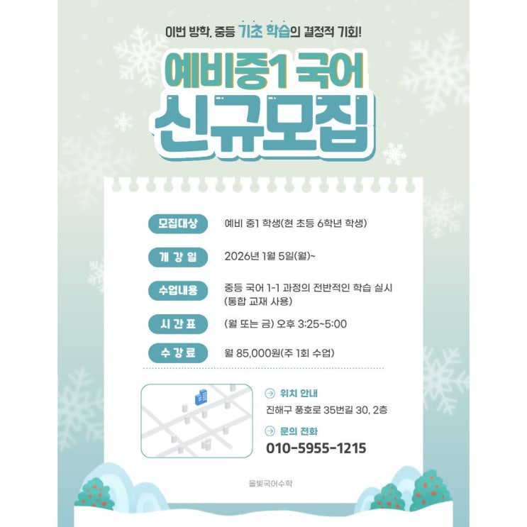 세상에 빛나지 않는 별은 없다! 안녕하세요. 진해 국어, 수학 학원 올빛국어수학입니다. 예비 중1 국어 신규 모집을 실시합니다. 1. 모집 대상 예비 중1 학생(현 초등 6학년 학생) 2. 개강일 2026년 1월 5일(월)부터~ 3. 수업 내용 중등 국어 1-1 과정의 전반적인 학습 실시 (통합 교재 사용) 4. 시간표 (월요일 또는 금요일) 오후 3:25~5:00 5. 수강료 월 85,000원(주 1회 수업) 6. 접수 및 문의 문자(톡), 전화 접수. 학원으로 연락바랍니다.(010. 5955. 1215) 감사합니다. <img src="https://blogthumb.pstatic.net/MjAyNTEyMTFfMjMg/MDAxNzY1NDQxMTY5MjM3.VatOMyRUov7r5KPi6jaKQMvQGEK_CpLNUA8pX5tSinkg.s4P_mrwCEDY2e5mMcxsjfb9Wpr1aPQHgOYWASWyOmdEg.JPEG/%C1%A6%B8%F1%C0%BB_%C0%D4%B7%C2%C7%D8%C1%D6%BC%BC%BF%E4._%281%29.jpg?type=s3" />
