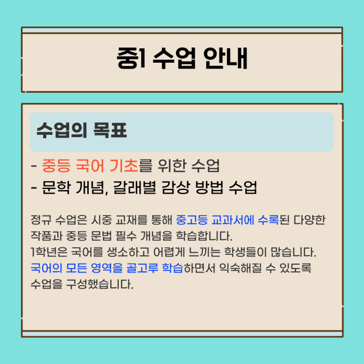 많이 문의주셨던 예비중1 반을 개강합니다! 수업에서는 선생님의 설명을 들으며 수업하고 주1회 학생 개별로 하는 클리닉이 따로 있습니다. 클리닉에서는 단편소설 읽기(+독서 퀴즈)와 어휘 학습를 진행합니다. 3월에 개학 후에도 시간표는 동일하게 통합 수업을 하고, 2학기 내신 수업을 할 때 학교별 분반을 합니다. (2학기 내신 개설 학교: 신정중, 신송중, 현송중) <img src="https://blogthumb.pstatic.net/MjAyNTEyMDZfMTM1/MDAxNzY1MDAwODM1MTg0.7zRIWLQ7u0fkAYrr8OFPW1bgi2qFTQEd_YHdNmhcoW0g.iXmgY_Fv95R_mAnFWFKFnJhuIwJZRj_Eql8agfkoeRIg.PNG/%BF%B9%BA%F1%C1%DF1-1.png?type=s3" />