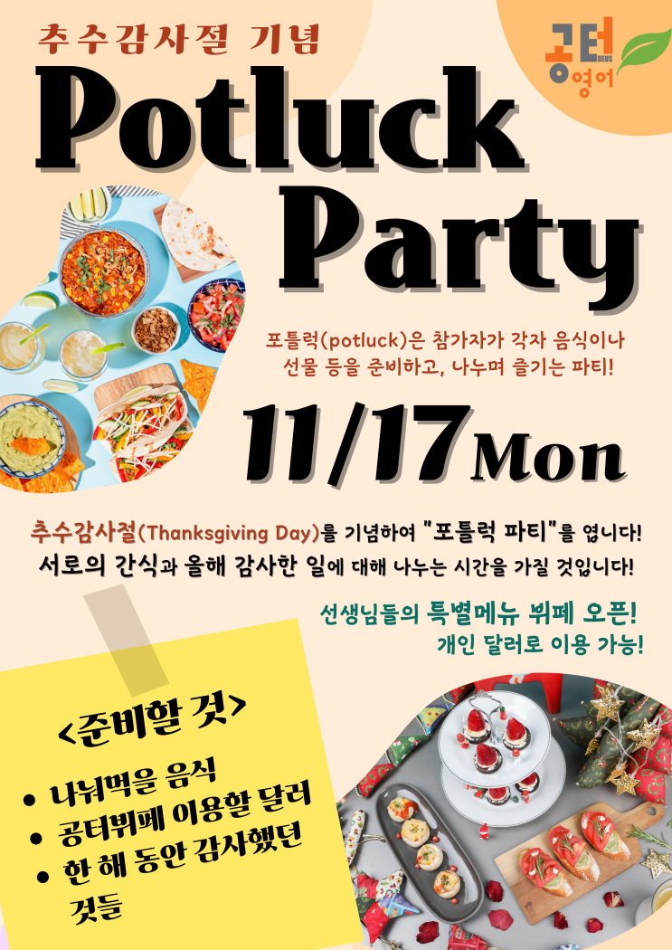 오늘은 추수감사절을 우리 공터친구들이 어떻게 보냈는 지 공유드립니다! 추수감사절을 맞이하여 포틀럭 파티를 열였습니다! 각자 맛있는 과자류부터 치킨, 닭강정, 피자, 과일꽂이 등 준비하여 학원으로 등원하였습니다! 선생님들도 샌드위치, 카나페, 조각케익, 수제초콜릿 등 준비해왔습니다~^^ 각자 가져온 음식이 뷔페 테이블 접시에 옮겨지는 동안 지난 1년 동안 감사했던 일들을 생각하며 예쁜 조개 껍질에 감사를 적었습니다. 그리고 음식을 먹으며, 누가 한 감사인지 맞추는 시간을 가졌습니다! 누구의 감사인지 맞추면 1달러 증정! "엘베에 갖혔었는 데 소방관님이 구해주셔서 감사해요!" 누구의 감사일까요? 맞춰보세요~^^ ....... <img src="https://blogthumb.pstatic.net/MjAyNTExMjBfMTM1/MDAxNzYzNjE5NzA0OTU0.GVQrkZYjKzuqDcAA-cUNpznwx3B-hTuyjp8sSfGRyv8g.4Iie7cCF7CHnD1VT8ygdGi05OLcwWgi9oRlLzRbAIvog.PNG/%C3%DF%BC%F6%B0%A8%BB%E7%C0%FD_%C6%F7%C6%AE%B7%B0%C6%C4%C6%BC.png?type=s3" />