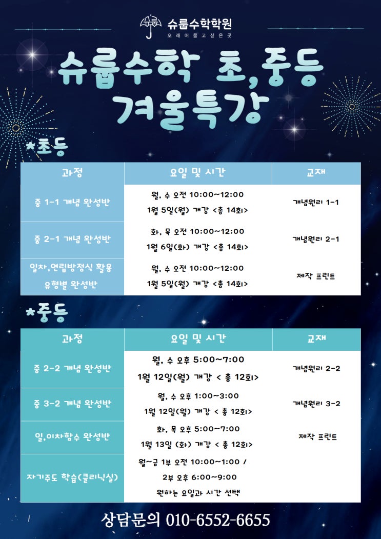 안녕하세요~ 슈룹수학 26년 1월~2월 동안 진행될 특강 안내해 드립니다! 초등학교는 대부분 31일에 방학하여 1월 첫째주에 개강하고 중학교는 대부분 9일쯤 방학이라 둘째주에 개강입니다! 특강비는 초등특강은 1월 8회 수업 19만 / 2월 6회수업 14만원 중등특강은 1월 6회 수업 18만 / 2월 6회 18만 (**교육청 교육비 기준) 입니다! 특강 수업 신청은 12월 15일 (월)부터 문자 혹은 전화로 받도록 하겠습니다~ 문의& 상담 010-6552-6655 <img src="https://blogthumb.pstatic.net/MjAyNTEyMTJfOTUg/MDAxNzY1NTE5ODg3NTA1.xPirbj-jtlfAvbxAcRtRgHJkg9yCaM0qVmMYYBJjyWAg.MKasng-Wb_6D4du6ws1SdxZqYJTubGNNqHL9v89l27sg.JPEG/26%B3%E2_%C3%CA%C1%DF%B5%EE_%B0%DC%BF%EF%C6%AF%B0%AD_%BE%C8%B3%BB.jpg?type=s3" />