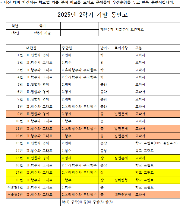 안녕하세요. 평촌 초중고 수학전문학원 패턴수학 유쌤입니다. 이번 글은 2025년 동안고등학교 1학년 2학기 기말고사 분석글입니다. 객관식 18문항 서술형 2문항 총 20문항으로 구성이 되어있습니다. 이전 시험과 마찬가지로 모든 문제가 교과서와 학교 프린트에서 출제가 되었으며 학교 프린트의 출처는 3번 문항만 EBS 올림포스 교재에 수록되어 있고 나머지는 EBS올림포스 고난도 교재에 수록된 문제입니다. 9번, 11번, 12번, 15번 문항은 모두 학교에서 사용하는 교과서의 중단원 문제 중 발전 문제에서 출제가 되었으며 약간의 변화를 주었지만 구성이 거의 비슷하다고 느낄 수 있습니다. 대부분 문제가 프린트와 비슷하게 출제가 되어 주요....... <img src="https://blogthumb.pstatic.net/MjAyNTEyMTFfODUg/MDAxNzY1NDU4NTM0MjIx.-wRWI2mFXNHa6mmuLtrl3yxYvVl9Rdhx-2e2FFEAcEkg.gRGnr7zXi59VcimxaeSZQp94USvskAUl9iVOfohfShog.PNG/image.png?type=s3" />