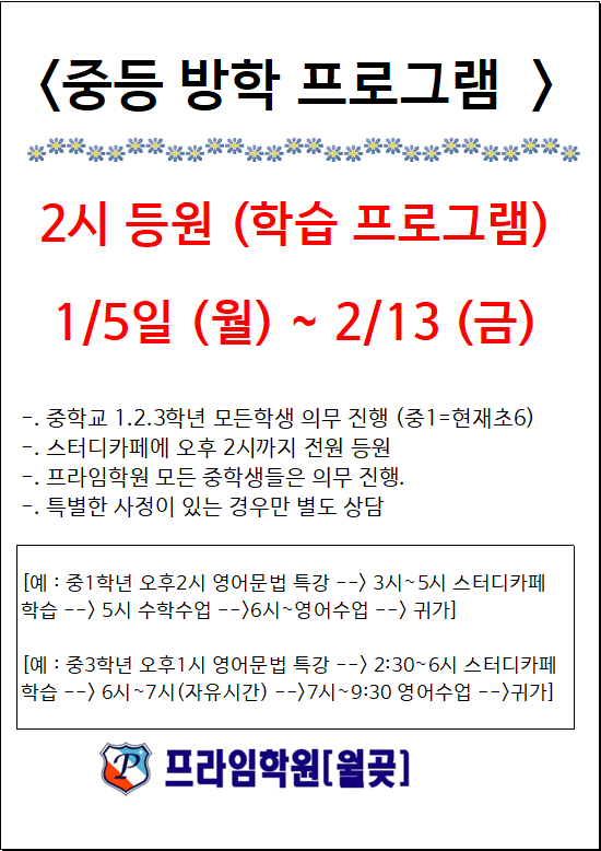 26년 1월~2월 겨울방학 중등생들의 학습 습관을 위해 오후 2시~7시 학원에서 공부하기 프로그램이 진행됩니다. 영어 문법 특강을 병행하여 스터디카페에서 오후 2시~오후7시까지 공부합니다. 중학교 학년에 따라 영어 수학 본수업 끝나는 시간에 귀가 시간은 달라집니다. 공부하는 습관을 만들어 가기위해 특강이 없어도 오후 2시에 스터디카페로 등원합니다. 프라임학원 모든 중학생들은 의무로 진행하며 특별한 사정이 있는 경우만 별도 시간표로 진행됩니다. 2달 이라는 긴 방학기간을 잘 활용하여 우리 학생들이 공부에 더욱더 좋은 습관이 만들어질것입니다. [예 : 중3학년 오후1시 영어문법 특강 --> 2:30~6시 스터디카페 학습 --> 6....... <img src="https://blogthumb.pstatic.net/MjAyNTEyMTNfMjE5/MDAxNzY1NTk2ODM0NTM0.aJVyp_v6Zv6IaGmo6BkEE2PZWiJtPdUJU6-jLVPtMmMg.WzVAt9Ym3XGrBhzlJ6ORr4Z_lld5ihTI3t1nE206l8Eg.PNG/%B9%E6%C7%D02%BD%C3_%C7%C1%B7%CE%B1%D7%B7%A5_%BE%C8%B3%BB%B9%AE.png?type=s3" />