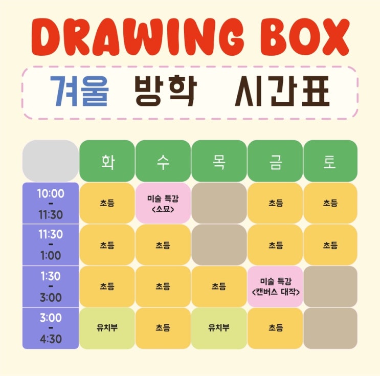 안녕하세요 드로잉박스 입니다~! 2025/2026 겨울방학 시간표 겨울방학 시간표는 12/30(화)부터 시작입니다 1월 1주차 시작_12/30(화) 12/30 (화) 부터 오전수업 열립니다!! 2월 1주차는 1/26부터~ 1/31입니다 왜냐면 2월 설날주를 휴무 주로 했기 때문입니다! 설날 휴무: 2/16 (화) ~2/21 (토) 겨울방학특강입니다 선착순 진행. 선택하셔서 학원으로 연락주시면 됩니다! 모두 5주 완성으로 진행합니다! <img src="https://blogthumb.pstatic.net/MjAyNTEyMDlfMjk3/MDAxNzY1Mjc3NTU4MzI4.qHFJOzsYLymuTQJuai_CiC3r6JghBFW5sVhhMKSwo90g.eG5zbZvCK3sk3niy2CbzjYtj4acky6QubfsVd9KzqDYg.JPEG/IMG%A3%DF4473.JPG?type=s3" />