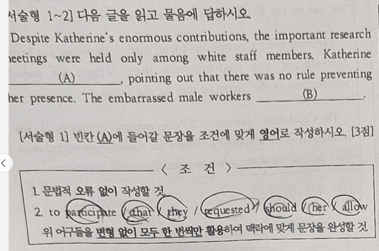 '기본기를 갖춰야한다'고 했었는데 대체 그 기본기가 어느 정도의 수준을 얘기하는 거냐? 라는 질문 또는 #제프리영어학원 관리에 대한 의문에 참고가 되셨으면 하는 바램으로 실제 문제를 가져와서 우리가 시험대비하며 준비한 것들, 기본기를 포함함 학생에게 요구되는 것에 대해 잠시 이야기해보고자 한다. 먼저 서술형 문제들. 주어진 단어를 배열해서 문장을 완성하는 문제이다. 출처는 교과서 3과인데, 실제 본문과는 상당히 다르게 쓰여졌다. 교과서 3과 본문과 비교해보자. 시작은 Despite~부터 이고 첫 문장은 동일하다. 하지만 빨간박스 부분이랑 시험지랑 비교해보면 다름을 알 수 있다. [교과서 원문] When she asked for ....... <img src="https://blogthumb.pstatic.net/MjAyNTEyMTNfMTYg/MDAxNzY1NTUxOTY5OTgx.2WoCDJcNA4FXhsUTZyGfausg6TrXvFK9AnaDvKcw-qAg.d8neAje9Hd-1vMs3excfzDdsWcUk1495OpK9qPMvHmog.PNG/image.png?type=s3" />