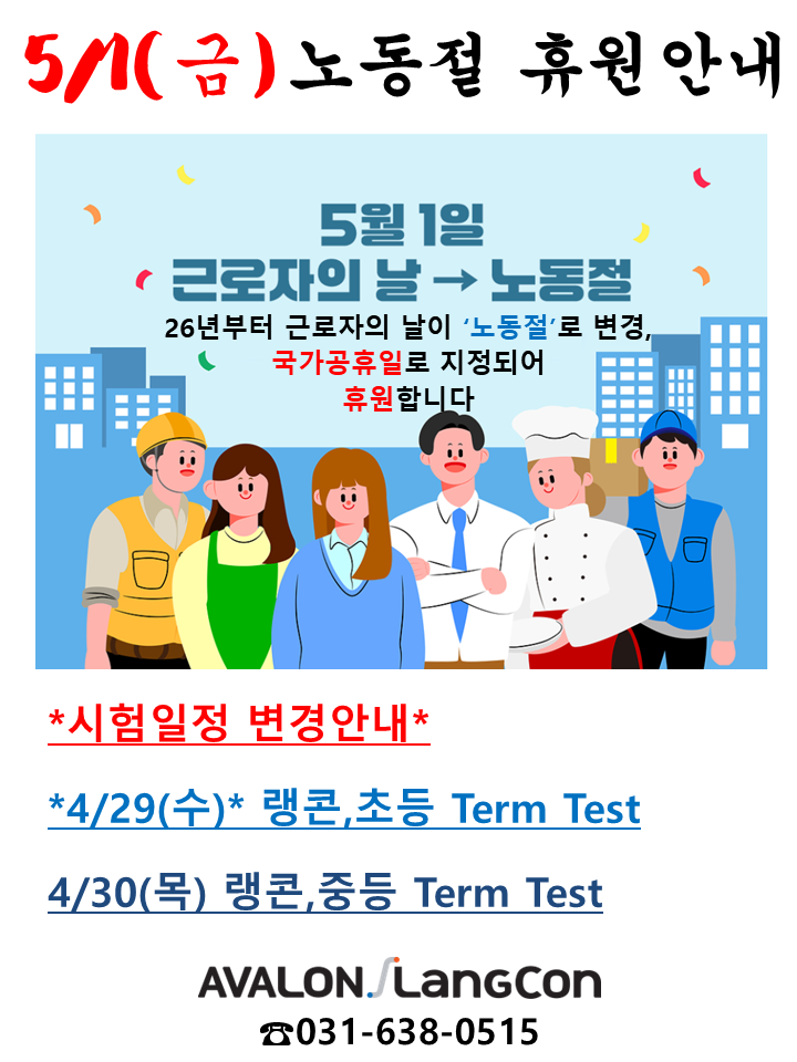 안녕하세요 아발론∫랭콘 이천어학원 입니다 오늘은 5월 1일 노동절 휴원 안내 및 우리 랭콘·아발론 학생들의 시험 일정 안내드립니다~ 26년부터 '근로자의 날'이 '노동절'로 변경, 국가공휴일로 지정되어 휴원합니다~! 시험 일정 변경된 내용 안내드립니다 원래 5월 1일(금)에 예정되어있던 랭콘, 초등 Term Test는 *4월 29일(수)*에 시험봅니다. 4월 30일(목) 랭콘, 중등 Term Test는 그대로 진행됩니다. ↓ 성취도 평가 안내 및 초등 Achievement 현장스케치 입니다↓ 영어의 시작, 파닉스부터 수능 대비까지의 로드맵을 제공해 줄 수 있는 체계적이고 전문적인 교육 아발론랭콘 이천어학원에서 경험해보세요! 더 자....... <img src="https://blogthumb.pstatic.net/MjAyNjA0MTZfMjQw/MDAxNzc2MzI0OTY5OTgy.CmjKPmNuwQHAikxt0WHlFPxhY2v_dkpj63Bv_k5LyAIg.6ye6k5ke5JSOLxRPlQ9uPASq37fa5ckvOwwPx9jjXG0g.PNG/5.1%B3%EB%B5%BF%C0%FD-%C8%DE%BF%F8%BE%C8%B3%BB.png?type=s3" />