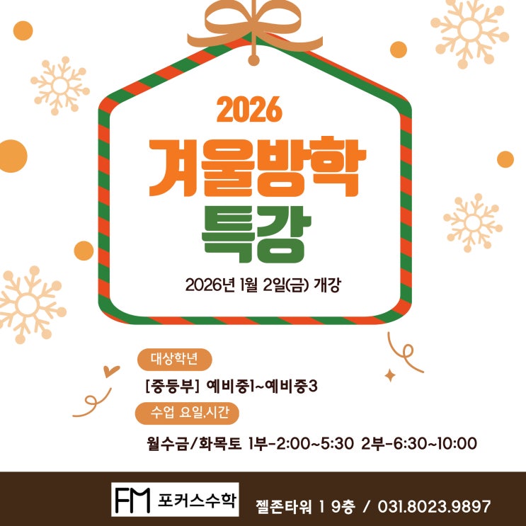 안녕하세요. 포커스수학학원입니다. 다가오는 겨울방학을 앞두고 수학 공부 계획을 고민하는 학부모님과 학생들을 위해 수학 학습 전략을 체계적으로 정리해드리려고 합니다. 겨울방학 집중적인 수학 학습을 해야하는 이유 ❄️ 겨울방학은 학생이 ‘수학 체력’을 재정비할 수 있는 가장 결정적인 시기입니다. 학기 중에는 수행평가, 학교 일정 등으로 수학을 집중적으로 공부하기 쉽지 않습니다. 하지만 방학은 오롯이 학습 흐름을 다시 세울 수 있는 시간입니다. 겨울방학 수학학습의 핵심 놓친 개념을 정확히 점검하고 보완할 수 있다. 진도 스트레스 없이 기초를 탄탄하게 다질 수 있다. 다음 학기 학교시험의 난이도 상승에 대비한 ‘....... <img src="https://blogthumb.pstatic.net/MjAyNTEyMDJfMTU5/MDAxNzY0NjYxMjgyMDAw.rtJd3ExySmMLP7NKnJnLdouVaoY9vi6K93bAgHaAvQwg.5bZZoP6Bz57GZIW9jfNI2CbyXiUCWEyPgJ6FdzVDV34g.JPEG/2026-%C1%DF%B5%EE%BA%CE_%B0%DC%BF%EF%C6%AF%B0%AD.jpg?type=s3" />