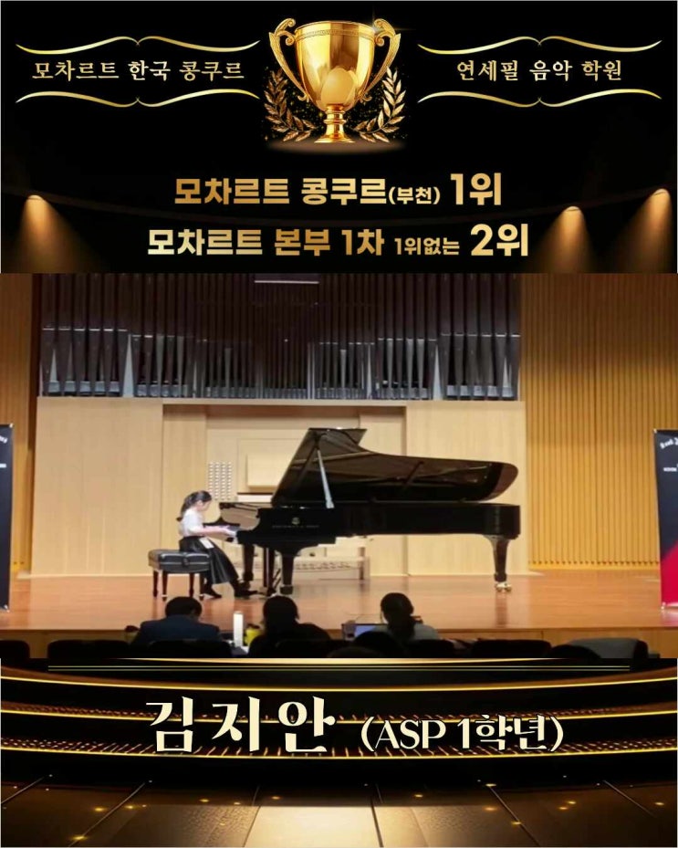 연세필 1학년 학생이 부천에서 열린 모차르트 콩쿠르에서 1위, 각 지부별 입상자들만 모인 서울 본부 1차 대회에서 1위 없는 2위(학년 최고점)를 수상하였습니다 모차르트의 작은 별 변주곡은 반짝반짝한 소리 톤과 높은 테크닉 수준을 갖추어 연주해야 하는 까다로운 고전시대 곡인데 1학년 학생이 너무나도 완벽하고 예쁘게 연주해 주었습니다 자기의 소리를 잘 들으며 연주 이해도가 높다는 심사평과 함께 학년 최고점을 받았네요 축하합니다 연세필 음악 학원 오시는 길 인천 연수구 신송로 161 송도 더 하이츠 8층 0507. 1411. 4466. 연세대학교 음악대학 졸업 원장 직강 시간 정원제로 질 높은 교육 연 6회 (짝....... <img src="https://phinf.pstatic.net/image.nmv/blog_2025_12_10_557/GYHcw0P0Hz_10.jpg?type=f480x480" />