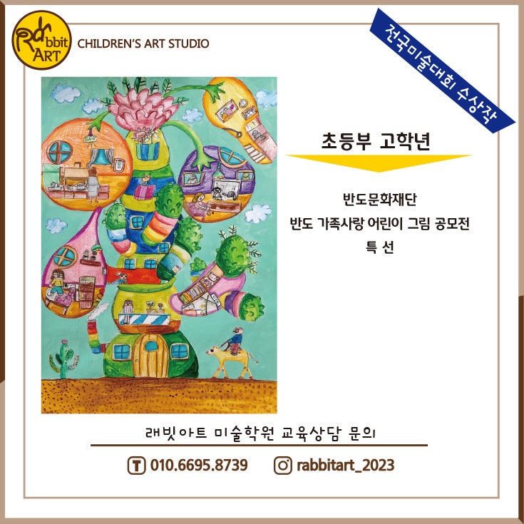 반도문화재단 가족사랑 어린이 그림 공모전 특선 수상 "우리 집을 옮길 수 있다면??" 이라는 주제로 상상속 공간에 새롭게 지은 멋진 우리집을 상상해요! [사막 선인장 하우스] #래빗아트 초등부 4학년 작품 ps. 아빠는.. 회사 퇴근시 육지에서 사막까지 낙타를 타고 모래바람을 뚫고 집에 안전 귀가하셔야 한다는 함정이 [안드레아의 아쿠아리움] #래빗아트 초등부 3학년 작품 ps. 아빠는.. 육지에서 배를 타고 무서운 바다 괴물들을 피해 집에 안전 귀가하셔야 한다는 함정이 아이들이 생각하는 아빠들의 퇴근은 왜 다들 힘드신 걸까^^;; 우리 아빠들 힘내세요!! 사랑하는 우리 가족들의 소소한 일상을 재잘재잘 공유하며....... <img src="https://blogthumb.pstatic.net/MjAyNjA0MDhfMTg2/MDAxNzc1NjU2NDc0NjYz.605pS9Z5sIYBNDSzkKdaKAyx6eOs6dRNkIEGjbXMUM4g.Tbx31vKdfDHxIzJoV9qoCcyogLromWsN0kjiD8NExI0g.JPEG/%C3%CA%B5%EE%B0%ED90.jpg?type=s3" />