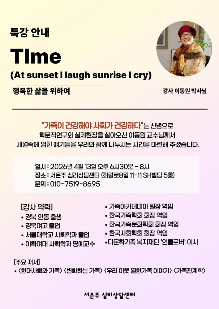 일상에 지친 이들에게 건네는 공감 요즘 밤에 잠을 잘 이루지 못하거나, 왠지 모르게 밥맛이 없다고 느끼신 적 있으신가요? 치열하게 하루하루를 살아내다 보면, 문득 두 발을 딛고 서 있는 대지가 흔들리는 것처럼 불안해질 때가 있습니다. 저 역시 매일 일상을 예술가의 시선으로 바라보고 기록하려 노력하지만, 때로는 삶의 무게에 마음이 지칠 때가 있습니다. 지난 4월 13일, 헛헛해진 '마음 근력'을 단단하게 채워줄 귀한 자리에 다녀왔습니다. 서은주 심리상담센터에서 열린 이화여대 이동원 명예교수님의 특강 <time>입니다. 강은희 대구시 교육감님을 비롯해 정말 많은 분들이 강연장을 가득 채워주....... <img src="https://blogthumb.pstatic.net/MjAyNjA0MjBfMTQ5/MDAxNzc2NjU0MzI3Nzc2.hnOXxwYlUeEih4GIyv_dEND1537W1rgUdiTiqYay-sog.MBnsIMOBIS0pv9hSE8BzOeDoJogQ8ZRJbqFmJ_cG_Mcg.JPEG/temp%A3%DF1775713849591.1907667132%A3%DF211874443507301.jpeg?type=s3" />