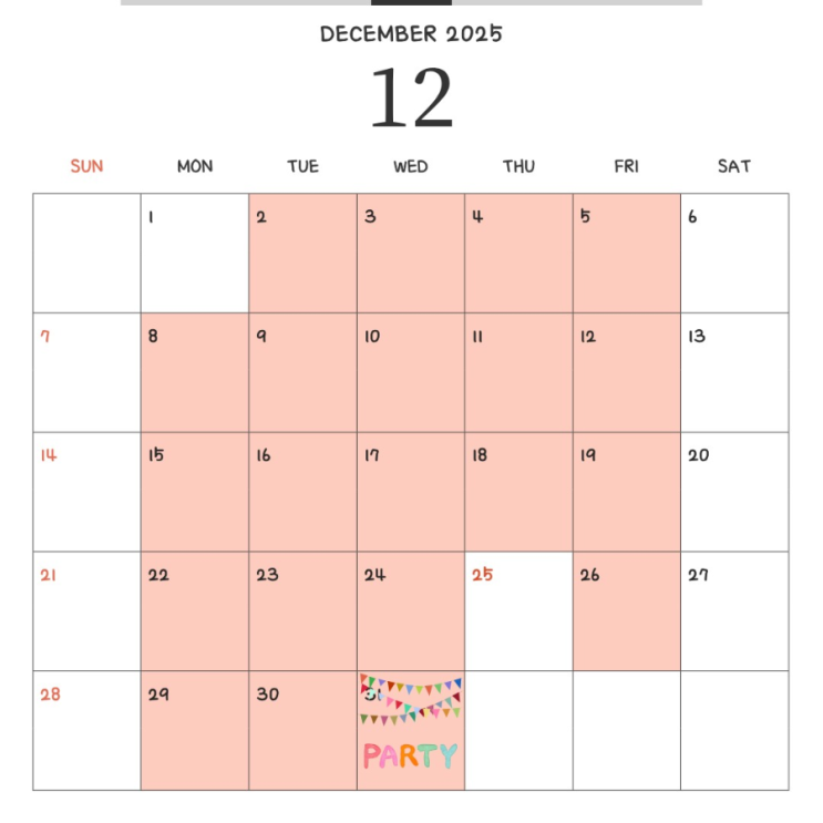 12월세션 안내입니다 [ 12월2일~12월30일 ] 12월31일은 마켓데이입니다 1월2일은 학원 방학입니다. 1월5일부터 1월세션 시작으로 정상수업합니다. <img src="https://blogthumb.pstatic.net/MjAyNTExMjRfNjIg/MDAxNzYzOTc2ODM3NTU1.pKBbFAx7b-LNOgSshyTl1h4X2H2L3k9OrgiTYXOC6dwg.go_Xagg87ZhBFCGeFlwQEA1n-4gqqXh0UEiM8mPWoasg.PNG/900%A3%DFBandPhoto%A3%DF2025%A3%DF11%A3%DF24%A3%DF18%A3%DF30%A3%DF00.png?type=s3" />