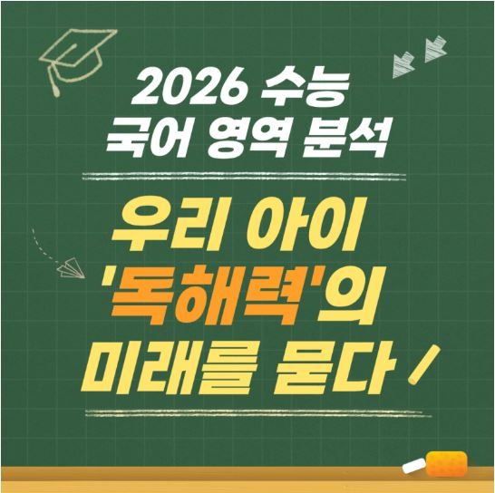 지난 13일에 치러진 2026학년도 대학수학능력시험 국어 영역 문제를 분석해 보니, 명확한 메시지가 하나가 떠오릅니다. 바로 '독해력'이 곧 '대학 경쟁력'이라는 사실입니다. 이 시험은 단순히 지식을 암기했는지 묻는 시험이 아니라, 지문을 이해하고 추론하며 사고하는 능력, 즉 우리 아이의 '생각하는 힘'을 평가하는 종합 시험이었습니다. 1. 독해의 단순 관점'으로 본 우리 아이 독서 습관 점검 우선 눈에 띄는 것은 첫 번째 독서 지문입니다. 이 지문은 '독해의 단순 관점'을 소개하며 독해 능력을 해독과 언어 이해라는 두 가지 핵심 요소로 설명합니다. 이는 초등, 중등 자녀를 둔 부모님....... <img src="https://blogthumb.pstatic.net/MjAyNTExMTRfMTQy/MDAxNzYzMTAzNzAyNjA5.FdNj_7Yv3fNZSdAMfBacvpOOSLgvNuxNiKvY90Oxo7Ig.DtRGNRErz9nQYPVIGVDn4lxrFpbaM2qUfwpjPMHPlaQg.JPEG/1.JPG?type=s3" />