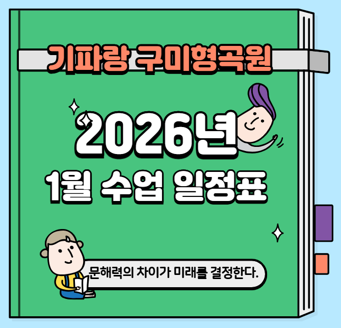 수업 관련 안내 2026년 상반기 개강은 12월31일 개강으로 시작 합니다. <<기파랑문해원 초등, 중등관 일정표>> 기파랑문해원 구미형곡원은 매주 수요일부터 일요일까지(같은색 날짜표시함) 동일한 진도로 수업이 진행됩니다. 부득이하게 결석할 경우 원으로 연락하시어 이동수업을 상담하시기 바랍니다. 매주 4주차 수업시간에 다음달 교재를 배부합니다. 결석 예정인 경우원으로 미리 연락을 주시고 이동수업 및 교재수령 약속을 잡아주세요. 교재를 수령하여야 과제가 가능합니다. 기파랑문해원이 문해력의 물결을 일으키겠습니다. <입학테스트 신청 바로 가기> 대상: 26년도 초 4학년 ~ 중 2학년 ⬇️ 아래 링크에서 입....... <img src="https://blogthumb.pstatic.net/MjAyNTEyMTVfNjEg/MDAxNzY1Nzc3MzA0NTQ4.fm9IElcliUsBOJ18qxcaRdr7odfHd80xSuY64zZdkB0g.ZqeRHw6OgesO07osHTovIXELa_6V3iX8QFMZLm1a_X8g.PNG/%BD%BA%C5%A9%B8%B0%BC%A6_2025-12-15_143936.png?type=s3" />
