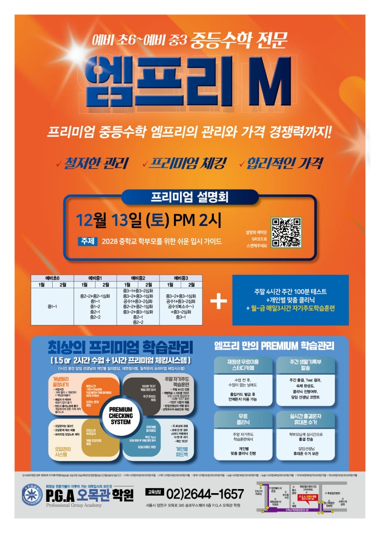 [목동 중등수학] 프리미엄 엠프리 겨울방학 프로그램 안내 - PGA오목관