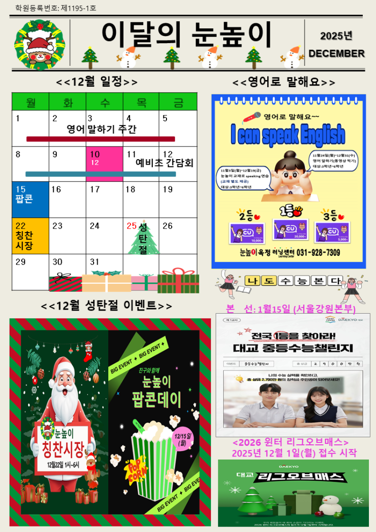 ✨ 이달의 눈높이 – 12월호 소개 ✨ 눈높이 옥정러닝센터의 12월 소식지입니다! 올 한 해를 마무리하며, 영어 말하기 주간, 팝콘데이, 칭찬시장, 성탄절 이벤트 등 재미있고 유익한 프로그램들이 준비되어 있습니다. 아이들이 즐겁게 배우고 성장할 수 있도록 다양한 활동과 이벤트 소식을 담았으니 학부모님들의 많은 관심과 참여 부탁드립니다. 행복하고 따뜻한 연말 보내세요! ✨ <img src="https://blogthumb.pstatic.net/MjAyNTExMjdfMTMw/MDAxNzY0MjI0Mjk1MTgw.tPy4VNLuogqUt3Gu1dmI8iSlGokHkmsFcIphWVBOBxgg.2eymP-X9bTrvt2XiqZzyy5NY-PUbWH8Zz-3FxoqZ0-8g.PNG/12%BF%F9%C0%CC%B4%DE%C0%C7_%BF%C1%C1%A4%BC%BE%C5%CD.png?type=s3" />
