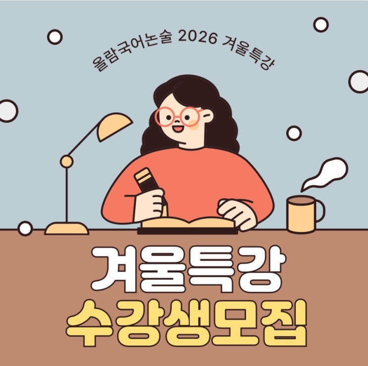 2026 겨울방학, 한 단계 더 성장할 시간 ✨올람국어논술 겨울방학특강 OPEN! 한 해를 마무리하고 새해를 준비하는 겨울방학, 학습 루틴을 세우고, 사고력과 표현력, 글쓰기 실력까지 놓치지 않고 키울 수 있는 시간입니다. 2026 겨울방학, 올람국어논술에서는 독서, 글쓰기, 수행평가 완성, 독해력 강화, 문법‧어휘 정리까지 맞춤형 특강을 준비했습니다. * 여름에는 6회로만 진행되었던 특강이 겨울에는 8회로 늘어 더 풍부하고 알찬 수업으로 진행됩니다. 모든 수업은 소수정예, 직접 제작한 교재를 활용해 진행합니다. 강사가 직접 기획하고 제작하는 수업 올람에서는 모든 특강과 정규수업을 단순한 ‘수업 제공’이 아닌, 기획부터 교....... <img src="https://blogthumb.pstatic.net/MjAyNTExMjVfMTkz/MDAxNzY0MDAyOTkxNDk2.5NpetL8tZkSEEm0UFR9y1bSrbK5FMLwA_nNs7Wg5z4sg.x4_RLNtIEDLPt9zb4DTts9WfjoMgfutUG2Er8dQPU4wg.JPEG/IMG%A3%DF0545.jpg?type=s3" />