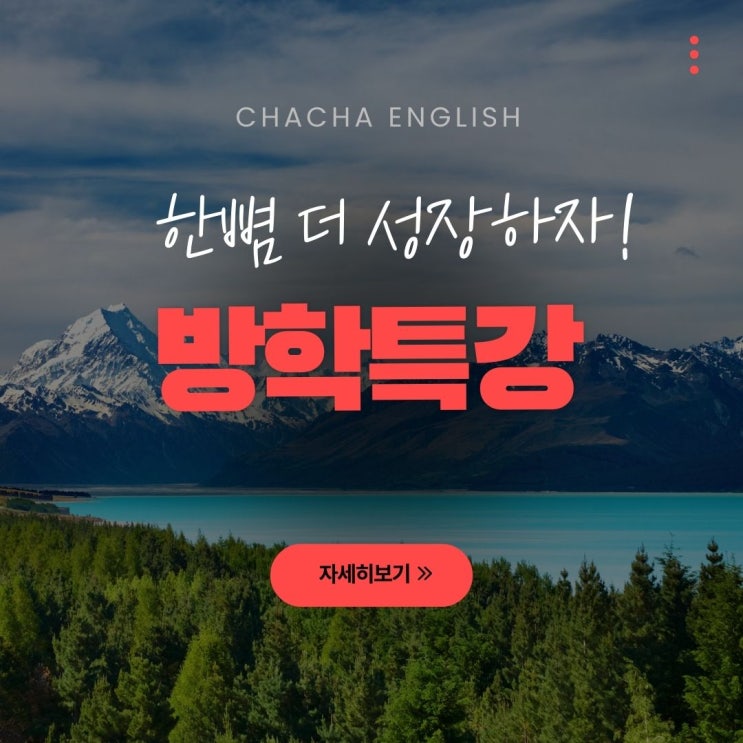 안녕하세요 차차영어학원입니다 ^^ 이번 겨울 방학에도 선생님들의 야심찬 특강들이 준비되어 있습니다^^ 다음은 특강 안내 입니다. 천천히, 그리고 꾸준히 쌓아가는 실력. 차차 특강이 아이들의 내일을 조금 더 단단하게 만들어줄 거예요. ✨ 다독 특강, 이런 학생들에게 딱 맞아요! 영어의 기초를 탄탄하게 다지고 싶은 학생 읽을 줄은 알지만, 문해력 단계가 아직 낮아 이해가 어려운 학생 자신 있게 말하고 싶은데 표현력이 부족하다고 느끼는 학생 ✨ Winter Booster, 이런 학생들에게 딱 맞아요! 학기 중에 진도가 너무 느려서 고민이었던 학생 개별 진도 중 모르는 문제들을 한 번에 정리해 질문하고 싶었던 학생 스스로 공부하는 힘, 자....... <img src="https://blogthumb.pstatic.net/MjAyNTEyMDlfMTIg/MDAxNzY1MjYyMTYxMTE0.EKTb7d6W-aYXHHhdQDkhOgHJRViUowDUocD4vS1GCkEg.7WuvTvDTWszE8457ecBAOfj78VxR27W4H6pgZxlgYLEg.JPEG/1.jpg?type=s3" />