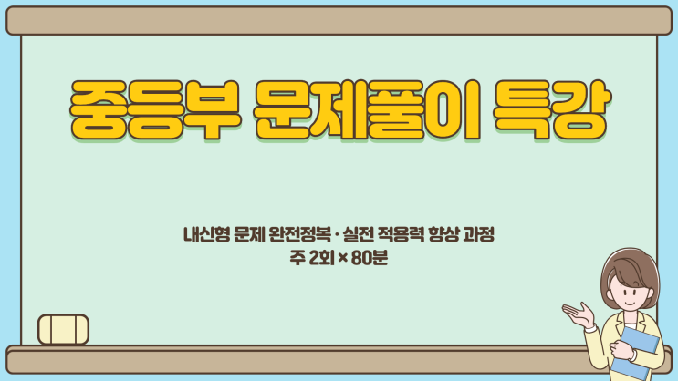 **중등부 문제풀이 특강 오픈! 내신형 문제 해결력, 6주 만에 완성합니다.** 안녕하세요, 더블레싱영어수학학원입니다 중학생 자녀를 둔 부모님들이 가장 많이 고민하시는 부분은 바로 이것입니다. “개념은 아는데, 문제만 나오면 틀려요.” “문장제·서술형 때문에 점수가 계속 떨어져요.” “시험만 보면 실수 때문에 점수가 확 깎여요.” 이 문제는 절대로 아이만의 문제가 아니에요. 중학교 수학은 개념에서 문제 난이도가 갑자기 높아지고 내신에서는 서술형·응용형·융합형이 비중을 크게 차지하기 때문에 정규 진도만으로는 문제 접근력과 실전력을 키우기가 어렵습니다. 그래서 저희는 ‘중등부 문제풀이 특강’을 개설했....... <img src="https://blogthumb.pstatic.net/MjAyNTEyMTFfMTE3/MDAxNzY1NDQwNDI1ODI5.hAxG7WTzYfyJ-IBZ8WHiutXLrxs9Aca5g9EKhdqkNsUg.m0VySm-XvPeZpwnxJwXu_1sHwft39mzpb3eFfaGkaQMg.PNG/1.png?type=s3" />