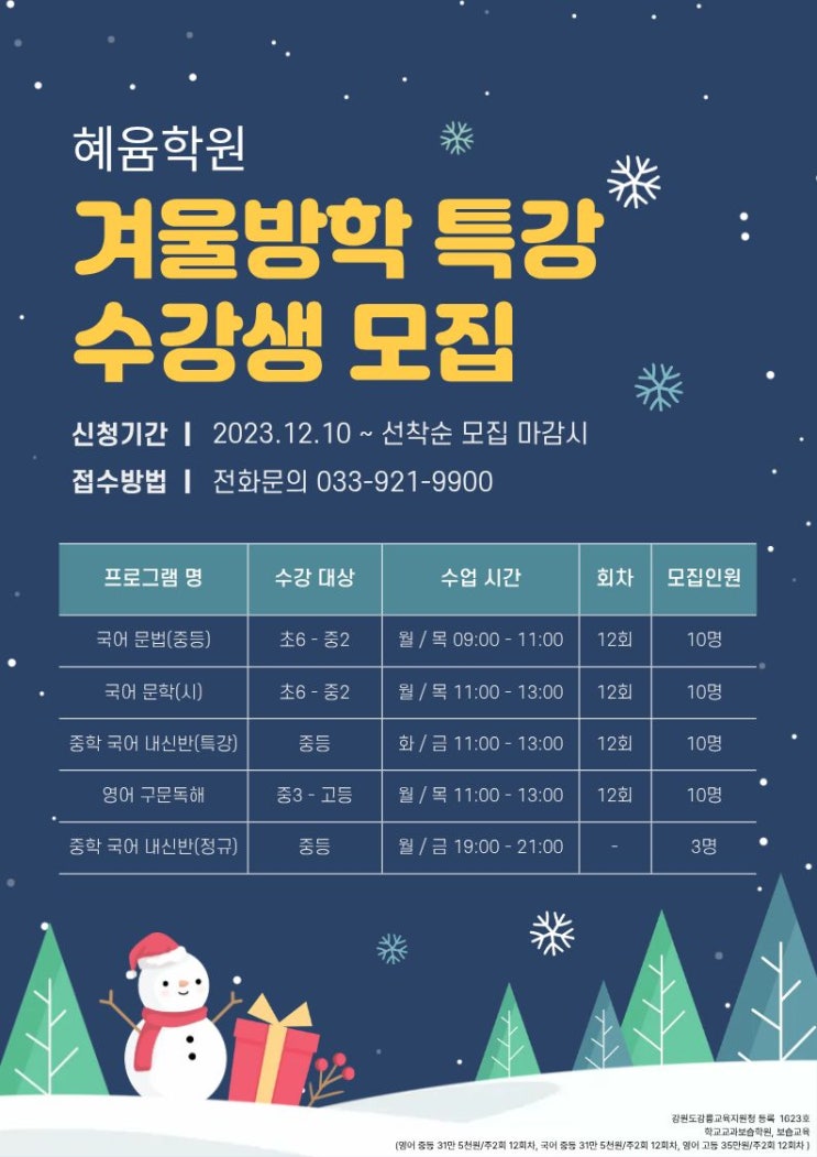혜윰학원 겨울방학 특강 1차 안내