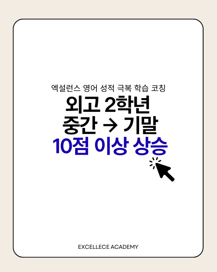 점수가 떨어졌을 때, 더 중요한 질문 시험이 끝난 뒤 “공부는 했는데 왜 점수가 떨어졌을까?” “문제를 더 풀려면 해결될까?” 엑설런스 영어에서는 이 질문부터 다르게 시작합니다. 점수가 흔들릴 때 필요한 건 문제의 ‘양’이 아니라, 학생에게 맞는 ‘방향’이기 때문입니다. 외고 2학년, 성적이 다시 올라온 실제 사례 이번에 소개할 학생은 외고 2학년 학생입니다. 중간고사 대비 기말고사에서 두 영어 과목 모두 10점 이상 상승 반복되던 실수 유형 약 50% 이상 개선 외고 시험 특성상 문제 수는 적고, 문제당 배점은 큰 구조이기 때문에 단 몇 문제의 실수가 점수에 크게 반영됩니다. 실력 문제가 아니라, ‘시험 상황에서의 판단’ 이....... <img src="https://blogthumb.pstatic.net/MjAyNTEyMTNfODMg/MDAxNzY1NTk4MDgyODg0.xpekxO0qRuId3tX0iDdnW5aEloh5_JTpUQKozHehj9sg.22GdoPCPaIFnsvGJE-QF3hlaXwRZmTMcJmIwXMxmp8sg.PNG/1.png?type=s3" />