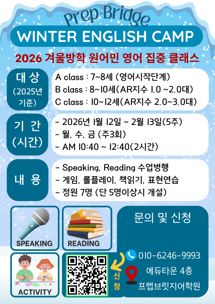 프렙브릿지는 매년 방학때마다 원어민선생님과의 영어캠프를 진행하고 있습니다. 기~~~~인 이번 겨울방학에도 신나고 알차게 영어세상으로 떠나 볼까요? 하루 2시간 2명의 원어민선생님과 일주일에 3번 만나면서 일상적인 대화부터 리딩북을 통한 상식등을 배우고, 이것과 관련한 게임, 롤플레이, 발표등 여러 방법들을 통해 영어실력을 키웁니다. 또한 초등학생들이 좋아하는 과학만들기, 그리기, 실험등 여러 활동들로 영어흥미도 더 높여줍니다. 이번 겨울방학도 저희 프렙브릿지와 함께 해 보실까요? 매일매일 공부하는게 행복할 수 있도록 항상 노력하는 프렙브릿지입니다. Your path to learning English step by step 프렙브릿지어학원 주....... <img src="https://blogthumb.pstatic.net/MjAyNTEyMDFfMTkx/MDAxNzY0NTY2MjM2NzY1.9RSmxqkCYsBUaGPIhenl3FWg0K82WUY1gtwZ7Yk7nYkg.F9vzVhrRnYJv9j5GPgpDNOE_DZZJ13qxPFP18L7Rdh0g.PNG/Prep-Bridge.png?type=s3" />