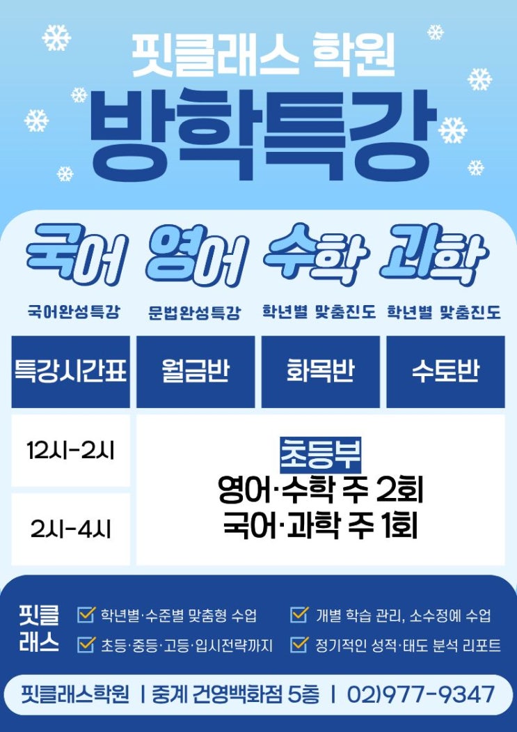 안녕하세요, 핏클래스 학원입니다. 어느새 한 해가 마무리되고 겨울방학이 다가왔습니다. 방학은 잠시 쉬어가는 시간이기도 하지만, 실력을 탄탄히 다질 수 있는 가장 중요한 시기이기도 하죠. 그래서 올해도 핏클래스에서는 학년별 맞춤 겨울방학 특강을 준비했습니다. 지난번에 안내드렸던 방학특강에 대한 세부 시간표를 지금 바로 알려드립니다. 아이들이 원하는 과목과 시간에 맞춰 수업을 들을 수 있도록 준비했으니, 참고해 주세요! 세부적인 시간표는 상담을 통해 맞춤 조정 가능합니다. 핏클래스 방학특강은 이렇게 진행됩니다 ✔ 수준별 소수정예 운영 ✔ 학생별 약점·패턴 분석 ✔ 질문이 편안한 분위기 ✔ 기초부터 심화까....... <img src="https://blogthumb.pstatic.net/MjAyNTEyMTJfNzcg/MDAxNzY1NTM0Mjk2MDY5.GHVUDj1exIgmjx2n4EPGQEyaKsTds6GWyI9_aTU9Q2sg.NfteQ9gOrd2HjwFAuZczE3cMvj0baWFt2i87Y5UGMo4g.JPEG/6.jpg?type=s3" />