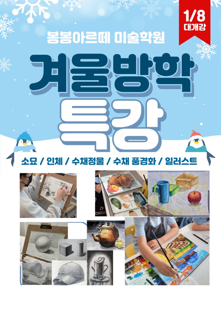 안녕하세요, 봉봉아르떼 미술학원입니다. : ) 다가오는 2026 겨울방학, 아이들이 미술의 기초를 단기간에 체험해볼 수 있는 겨울방학 특강을 진행합니다. 평소 미술학원을 다니지 않는 친구들도 부담 없이 참여할 수 있도록 구성했으며, 소묘·수채화·정물·풍경·인체 등 다양한 기본 수업을 한번에 경험할 수 있는 소중한 시간이 될 것 같습니다. : ) 이번 특강은, 입문편 / 상급학년의 난이도 조정 아이 개개인의 이해도에 맞춘 맞춤형 단계별 진행 으로 더욱 편안하고 즐겁게 참여할 수 있습니다. 수업 프로그램은 소묘 기초(도형·사물 소묘) 새해 겨울 테마 수채화 정물 소묘·수채화 인체 드로잉(비율 이해) 동물·풍경 기초 표현 등 모든 수업....... <img src="https://blogthumb.pstatic.net/MjAyNTEyMDdfMTM0/MDAxNzY1MDk5NjE3Nzgz.70ZReYaKLt2q-lDbpsE3OQ9DQi5gaBgqCP1-dVDcGQYg.b1f6FZSTy1iDe-o9JXc2YmHxsOGWqRv8u6P3l81ZgQAg.JPEG/%C6%AF%B0%AD.jpg?type=s3" />