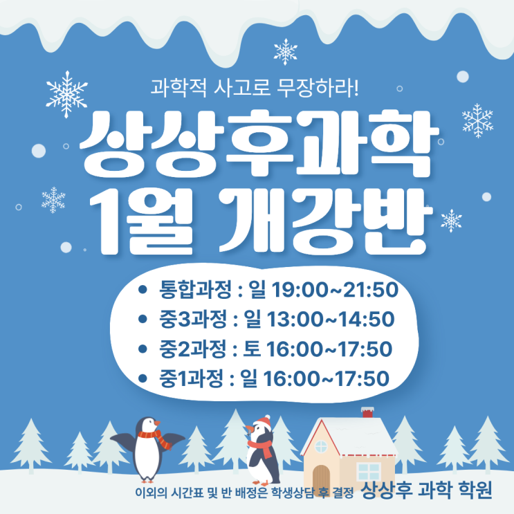 ❄️ 상상후 과학 1월 개강반 안내 학년별 핵심 개념 정리와 문제풀이로 겨울방학 동안 과학 실력을 효율적으로 강화합니다. 개강 시간표 통합과정: 일 19:00~21:50 중3 과정: 일 13:00~14:50 중2 과정: 토 16:00~17:50 중1 과정: 일 16:00~17:50 수업 특징 전공별 선생님 지도 : 정확한 개념 설명과 단계별 문제풀이 개념정리 워크북 제공 : 핵심 개념 복습에 최적화 주중 클리닉 운영 : 약점 보완 및 개별 학습 점검 ️이외의 시간표 및 반 배정은 학생 상담 후 결정합니다. https://blog.naver.com/6746667/224051534085 통합과학 350,000/중등 과학 270,000 <img src="https://blogthumb.pstatic.net/MjAyNTEyMTFfMjcz/MDAxNzY1NDQ2NTM1NTM5.By9K0OeNHeEFkN6-9l4C7pQexwLxKgIsonGyq2xU8dAg.To7ezS2a243EOa6o3qX-vJOVErPEFqHAUi6MSkdK4_0g.PNG/%C1%A6%B8%F1%C0%BB_%C0%D4%B7%C2%C7%D8%C1%D6%BC%BC%BF%E4._%281%29.png?type=s3" />