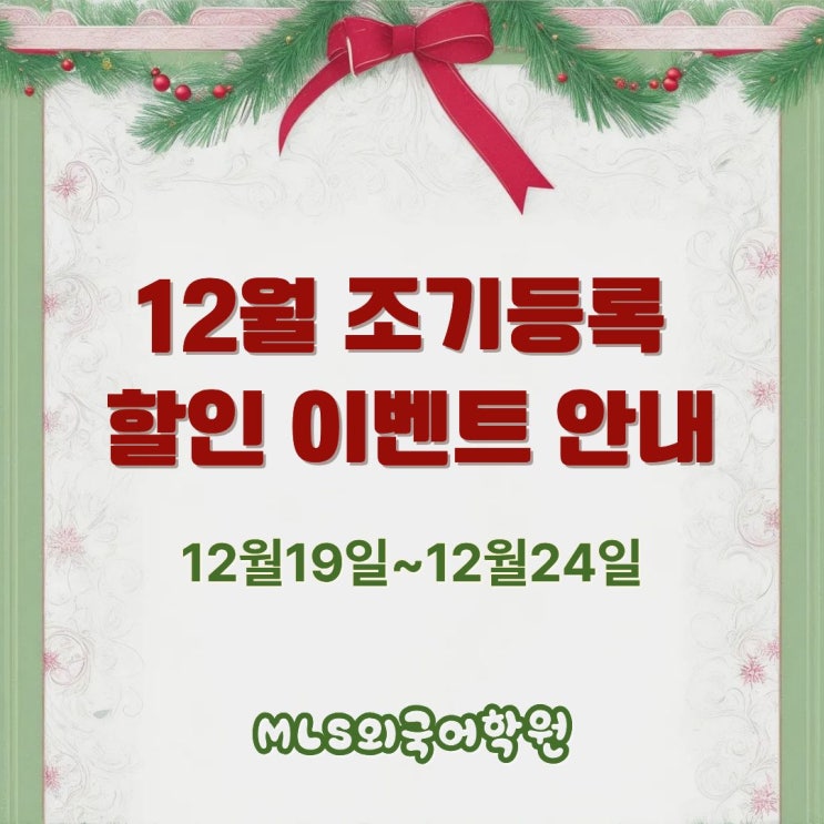 안녕하세요 여러분! 부산 남구 대연동 MLS 외국어학원입니다. 어느덧 한 해의 끝자락, 12월이 되었습니다. 2025년 한 해 동안 바쁜 일상 속에서도 외국어 공부를 포기하지 않고 꾸준히 이어오신 모든 학습자분들께 진심으로 감사의 말씀을 전합니다. 매주 수업에 참여하고, 익숙하지 않은 표현을 반복해 말해 보고, 때로는 더디게 느껴지는 실력 앞에서도 자리를 지켜주신 그 과정 자체가 이미 큰 성장입니다. 12월 조기등록 안내 2025년의 ‘꾸준함’이 2026년의 ‘실력’이 됩니다 외국어 공부는 단기간에 완성되지 않습니다. 하지만 꾸준히 쌓인 시간은 반드시 실력으로 남습니다. 2025년 한 해 동안 회화가 조금 더 자연스러워졌고....... <img src="https://blogthumb.pstatic.net/MjAyNTEyMThfMjA2/MDAxNzY2MDU1MjY2NjA5.yRIHC9RfBjrtpaR0b7Y7QZZjPeQfC4ed8P1EKWFDsnUg.AkQlZmvGP60eIMvaXVuHggsM5sMr2hHZMkoCdXaKrv8g.JPEG/1.jpg?type=s3" />
