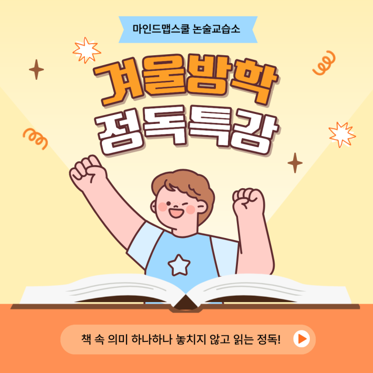 저희 마인드맵스쿨논술교습소가 새로운 독서 프로그램 "정독"을 본격적으로 시작해보려고 합니다 :) 곧 다가올 겨울방학을 독서로 채우면 어떠실까요? 책 속 의미 하나하나 놓치지 않고 읽는 정독! 겨울방학 정독특강 한번 신청해보세요~:) 4학년 이상은 4주 동안 1회당 90분입니다! 1, 2, 3학년은 1회당 60분입니다 특강을 선택하실때 특강 중 총 몇권을 할지 선택하시면 됩니다! 1권은 주 1회, 2권은 주 2회, 3권은 주 3회, 4권은 주 4회입니다 정독특강 시간은 월~목 A타임 10:00-11:30, B타임 11:30-13:00으로 구성되었어요~ 또 특별한 시간 多독多독데이가 있는데요:) 금요일 10-13시동안 자유롭게 독서할 수 있는 시간입니다 월....... <img src="https://blogthumb.pstatic.net/MjAyNTExMTNfMjAg/MDAxNzYzMDEyODkyOTY1.9oeLE3Y1xDxRpVmKGzT0xPsz_PyQq9arnCiBjOZ70-Qg.1rmwvwMi6AHADnuNCbtu3BXPHYh87P-cHC3fNL6tBXAg.PNG/1.png?type=s3" />