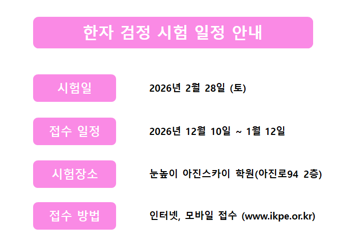 안녕하세요! 눈높이 아진스카이 학원입니다 :D 한자 급수 시험을 안내해 드리기 위해 이렇게 인사 드립니다 벌써 2026년이라는 말을 쓰게 될 줄 몰랐습니다.. 시간이 너무 빠른거 같아요ㅠㅠ 2026년 보통 겨울방학이 길어 한자 급수 준비를 하는 친구들이 많이 있습니다! 아직 도전해보지 않은 친구들도 이번 기회에 새로 도전해보는 것도 좋은 경험일 거 같아요! 구체적인 일정은 다음과 같습니다. 접수 링크 안내 https://www.ikpe.or.kr/ 접수 방법 안내 위 링크를 들어가신 후 "한국 한자 검정"을 클릭해 주세요. 회원 가입 후 "고사장 CBT시험신청"을 클릭해 주세요. "회원 가입 시 학생은 학생 회원가입! 성인은....... <img src="https://blogthumb.pstatic.net/MjAyNTEyMTZfMTQ1/MDAxNzY1ODU0Njk4NTY5.DUKHXT4Cu9Gy9H-nNM0Pty_cN52mI2vMu0TgftAg3-Mg.U01hBZLyJ76ZSAcXzRXf5-uPWYE4fEFlIym0L55RcxQg.PNG/image.png?type=s3" />