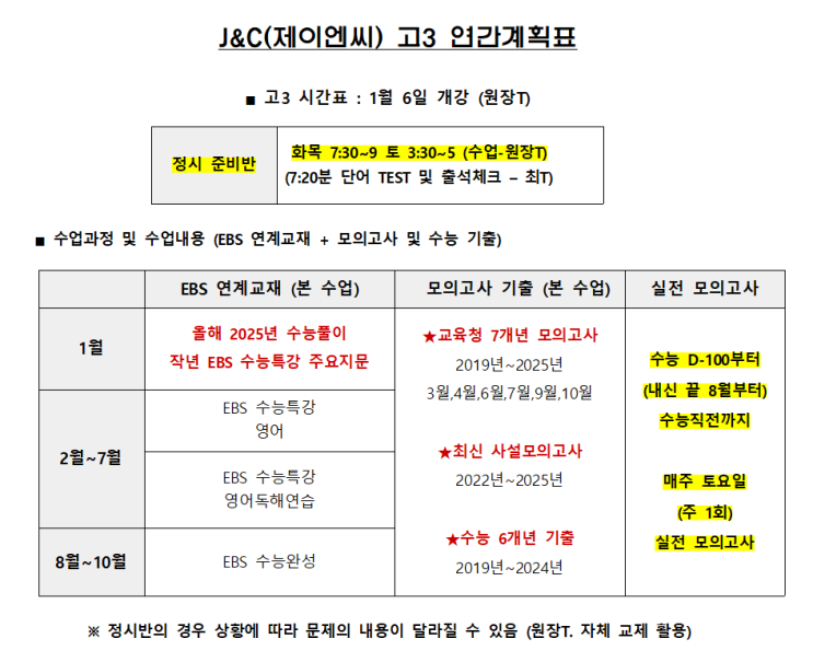 고3 내신준비반 (1월5일 월요일 개강) 시간표 : 월수금 7:30~9 (90분) 고3 정시준비반 (1월6일 화요일 개강) 시간표 : 화목 7:30~9 (90분) 토 3:30~5 (90분) <img src="https://blogthumb.pstatic.net/MjAyNTEyMTJfOTEg/MDAxNzY1NTI1MTA3OTAz.LYKOjXwwdcmCT86VAYLsqoZvdwoEHt3heLnhitEQSbgg.fTnao5RguoRLIxfizX7uTSpDohhEy32V13LyG0jp0f0g.PNG/%C8%AD%B8%E9_%C4%B8%C3%B3_2025-12-12_163504.png?type=s3" />