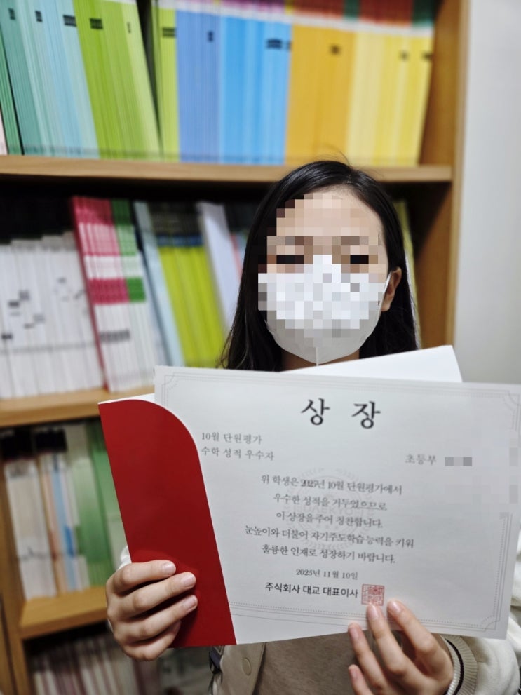 오늘 우리 아이들이 열심히 준비한 단원평가 결과를 바탕으로 상장 전달식을 진행했습니다. 한 달 동안 배운 내용을 다시 확인하고, 스스로의 실력을 체크하는 시간이라 아이들도 긴장 반, 기대 반이었어요 "두개 왜 틀린지 이유를 알겠어요!”, “다음엔 이 부분 더 잘해볼래요!”라고 스스로 말하는 아이들의 모습이 참 기특했습니다. 매달 단원평가 난이도에 따라 커트라인 점수를 정하여 우수한 회원들은 매월 40-50명 상장과 미니간식 전달 포상하고 있습니다. 눈높이 화명학원 362.8080 <img src="https://blogthumb.pstatic.net/MjAyNTEyMDNfOTUg/MDAxNzY0NzMwMTA0OTc2.3OvJ-645ULCmZAbLt357lMXvcztQFKwHf3AaYaLnlfQg.hDZ3GV9pxzjsLK9CE0i0lzeiTtNdMa7VqBBjxfIOLogg.JPEG/900%A3%DF1764730104288.jpg?type=s3" />