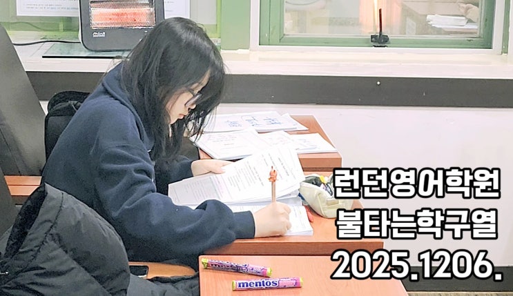 런던영어학원생 불타는 학구열 다음주 월욜 수성고 영어시험 오늘부터 금+토+일 3일동안 불타는 직전보강 주말강행군 축! 영어 100점! 성적은 철저한 자기관리와 공부한 시간의 절대량에 비례한다 문제는 실천력이야! 집중력있게 몰입공부! 매일 학습플래너 작성하며 나의 공부량을 정확히 체크! 영어공부가 어렵고 힘들면 지산범물 중고등부 영어전문학원 런던영어입시학원으로 오세요~. 수성구 범물동 수성동아백화점 바로 옆 학습 상담 : 010-7535-0380 <img src="https://blogthumb.pstatic.net/MjAyNTEyMDZfMjIg/MDAxNzY1MDI4NTY1Njc1.tv-ADVSi5_GsTVcCeq9n9f1S6AvPm0E7HALfaTh1tpMg.oy-7jmq41gnnAumMap1aVVkYr9OCtvp4xW-l6xL1oRcg.JPEG/Screenshot_20251206_204031_Video_Player.jpg?type=s3" />