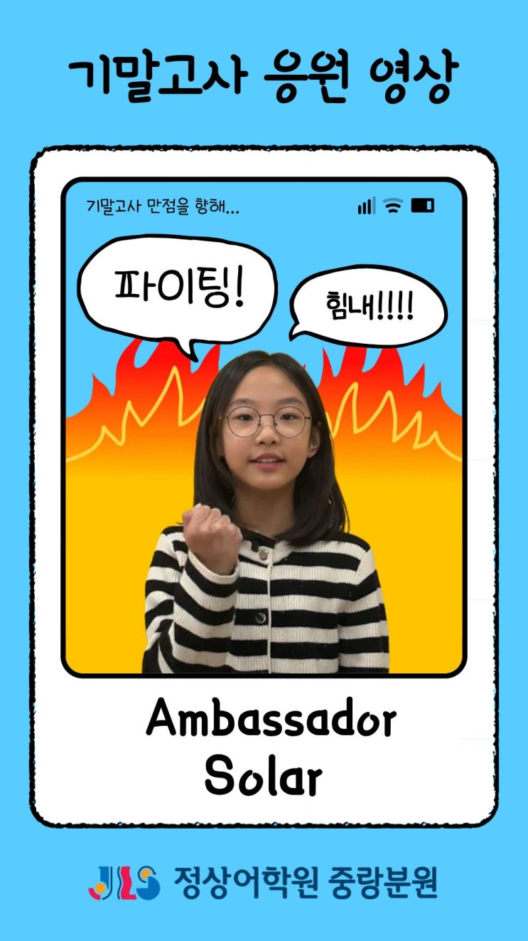 기말고사가 다가오면서 학생들이 가장 긴장되는 시기를 보내고 있죠. 그래서 이번에 앰버서더 Solar가 특별한 응원 영상을 준비했습니다! 학생들에게 꼭 전하고 싶었던 메시지들이 가득 담겨 있어 시험 준비 중에 큰 힘이 될 거예요 ☀️ ⸻ 영상 속 Solar의 응원 메시지 요약 영상에서는 Solar가 밝은 에너지로 다음과 같은 메시지를 전합니다. ✔ “지금까지 정말 열심히 공부했어요!” 그동안의 노력이 절대 헛되지 않았다는 따뜻한 격려가 담겨 있어요. 모두가 꾸준히 공부해온 만큼, 이번 기말고사에서도 좋은 결과를 기대할 수 있다는 응원을 전했습니다. ✔ “자신감을 가지고, 집중하고, 스스로를 믿으세요!” 시험 전 가장 중요한....... <img src="https://blogthumb.pstatic.net/MjAyNTEyMTBfMjA5/MDAxNzY1MzYyNDAwNTI1.O5L-ZFOWkAGbowm1Ljkjn4E9B--7OhV7GVmbbnYk8gcg.4TwO1Bd_7YtwerChCNIZLqefXfvTTZyptXlIq3o4Vbsg.JPEG/%25EC%25A0%259C%25EB%25AA%25A9%25EC%259D%2584_%25EC%259E%2585%25EB%25A0%25A5%25ED%2595%25B4%25EC%25A3%25BC%25EC%2584%25B8%25EC%259A%2594._%252820%2529.jpg?type=s3" />