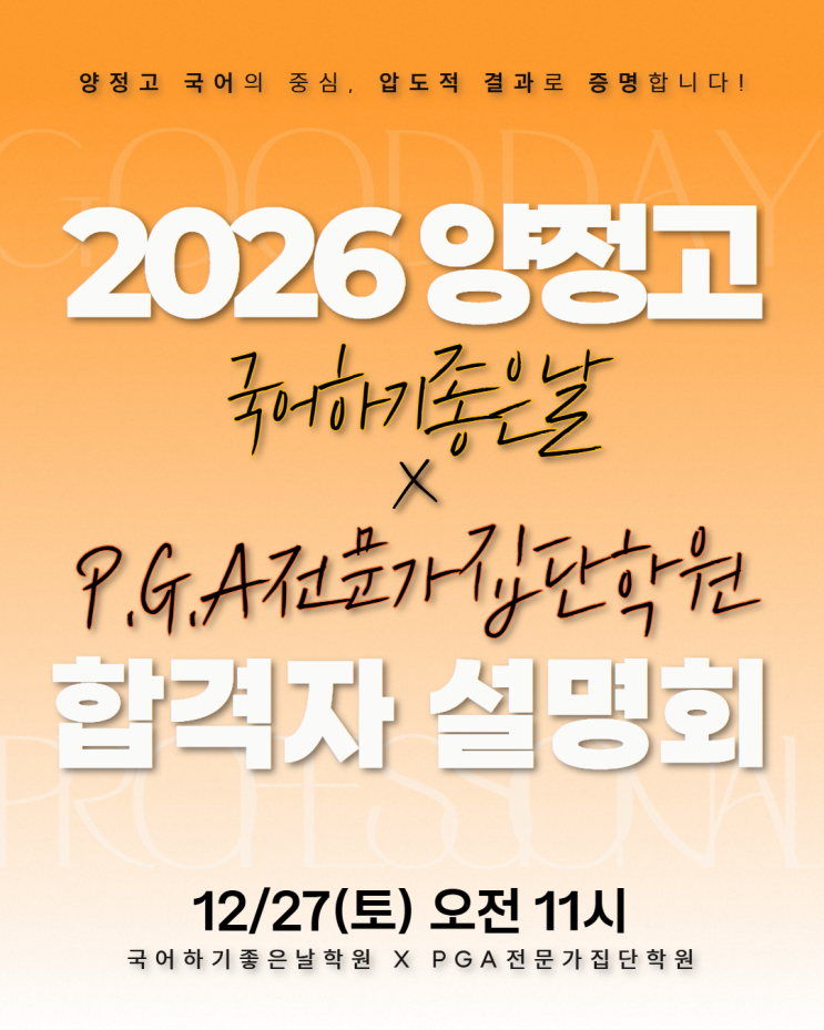 안녕하세요. 국어하기좋은날입니다! 국어하기좋은날 × PGA전문가집단학원 “양정고 국어의 중심, 압도적인 결과로 증명합니다.” 양정고 내신과 2026학년도 수능 국어에서 독보적인 결과를 만들어낸 국어하기좋은날과 PGA전문가집단학원이 양정고 합격자 설명회를 진행합니다. 양정고, 어떻게 준비해야 할까? 압도적인 결과로 증명된 독보적인 양정 시스템을 보여드리겠습니다. ✔ 양정고 3년 연속 최다 수강 → 결과로 검증된 양정고 전문 시스템 ✔ 졸업생과의 Q&A 시간 → 어디서도 듣기 힘든 양정고 전교권 신화 이야기 ✔ 전교 1·2·3등이 직접 전하는 내신 전략 → 실제 성적을 만든 공부법과 성적 관리 노하우 공개 ✔ 데....... <img src="https://blogthumb.pstatic.net/MjAyNTEyMTNfNDQg/MDAxNzY1NjA1NTk4MjM3.CpCiO_juERED6cNx_VNX6akinvU8q1k5c9MqTlKawQEg.EoogCXUJrp0pmn6pmHzgltHQDS7uIpYiTzNj2EM7g40g.PNG/2026%BE%E7%C1%A4%B0%ED%BC%B3%B8%ED%C8%B8_%281%29.png?type=s3" />