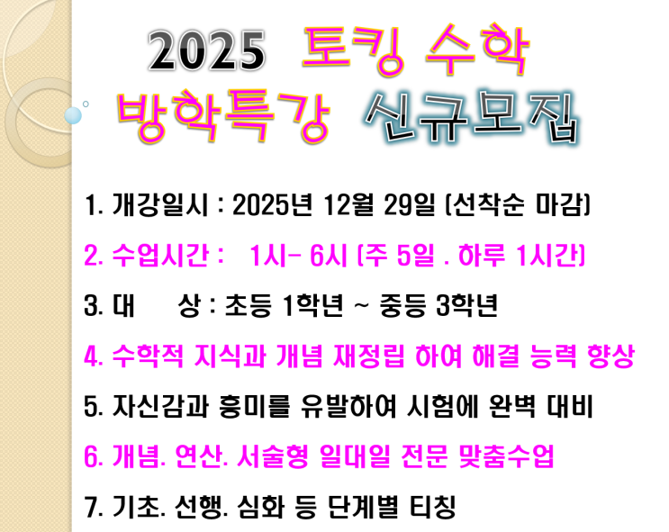 겨울 방학은 부족한 부분을 채우고 다음 학기의 공부의 방향을 잡을 수 있는 좋은 기회라고 생각합니다. 특히 1. 2 학기 성적이 저조한 학생들은 부족한 부분에 대한 학습과 다음학기 예습을 할 수 있는 기간입니다. 수학의 기본 개념. 응용이 부족한 학생들은 2학기 성적이 좋다하더라도, 다음 학년에 어려워지는 새로운 문제의 적응 및 심화. 서술형에서 어려움을 겪을 수 있습니다. 토킹투유학원에서는 2025년 12월 29일(월)부터 2026년 2월 27일(금)까지 수학 방학 특강 [2학기 복습 및 1 학기 선행 학습]을 진행하려고 합니다. 저희 학원은 다양한 문제를 반복함으로서 학생들이 개념을 이해하고 심화문제를 풀이하면서 수리.연산능력, 사고....... <img src="https://blogthumb.pstatic.net/MjAyNTEyMTFfNDIg/MDAxNzY1NDM2ODM5ODcy.fpc1TDfqAPPlu7kA_utVf6TZPAndAVipMStvPVFGvf0g.fzmhlfb0WCAX4Hp-z5-jxANmBEOthx2oMs96w9CumCog.PNG/%B9%E6%C7%D0%C6%AF%B0%AD.png?type=s3" />