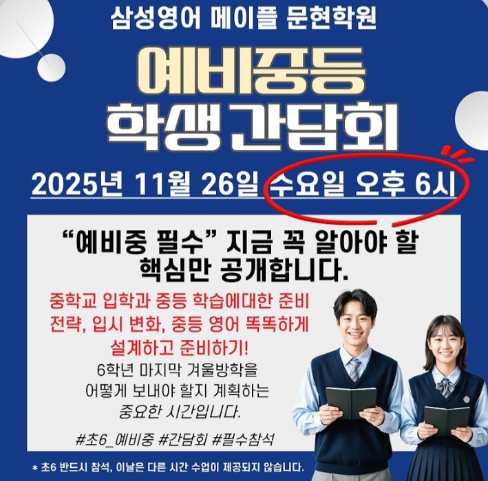 겨울방학은 아이의 중학교 첫걸음이 흔들리지 않도록 준비해야 하는 시기입니다! 초등 6학년의 11월은 부모님 입장에서 참 미묘한 순간입니다. 어느 정도 학습 습관도 잡힌 것 같고 영어도 크게 문제 없어 보이지만 막상 중학교 입학을 눈앞에 두면 마음이 갑자기 조급해집니다. 많은 학부모님들이 상담에서 말씀하십니다. "지금은 괜찮아 보이는데 중학교 가면 분위기가 완전히 달라진다던데 우리 아이도 괜찮을까요?" 이 불안은 결코 과한 걱정이 아닙니다. 왜냐하면 중학교 영어는 초등과 구조 자체가 완전히 다르기 때문입니다. 단원은 많아지고, 문법은 갑자기 깊어지고,처음 접하는 유형의 문제들이 시험 범위에 등장합니다. 특....... <img src="https://blogthumb.pstatic.net/MjAyNTExMjFfMjIg/MDAxNzYzNjk1MDc5NDc3.lH61mXXMJv2O8EPe3mSTMIgqJAmJUwwedsoisTFsuocg.PCKJeXzY8dUxREsbkHqc4uDM_rx7mXHZQlECInglkhIg.JPEG/KakaoTalk_20251119_235400670.jpg?type=s3" />