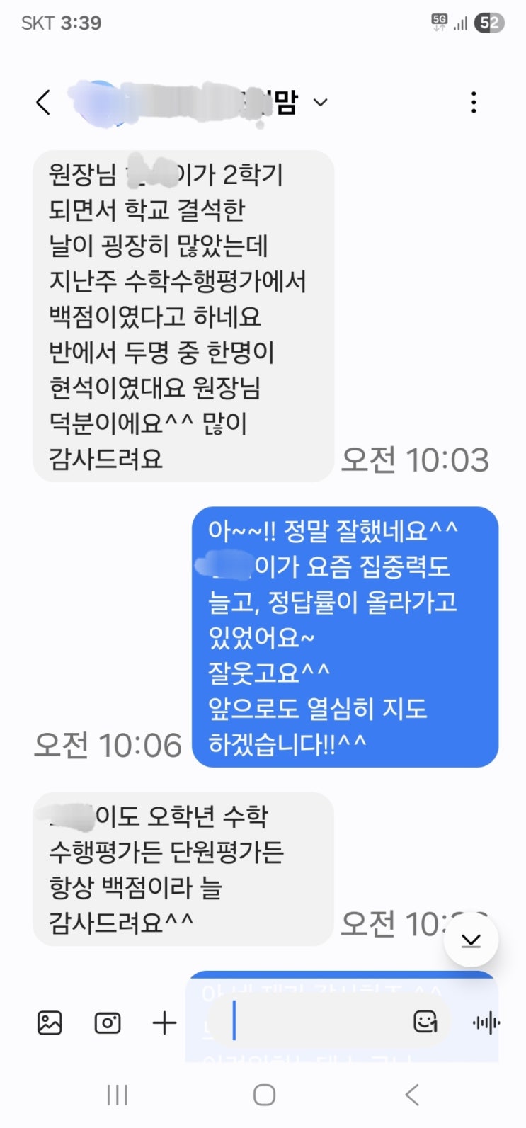 학부모님의 칭찬 메세지에 한껏 기분 업!! 더 열심히 학생들을 가르치고 싶은 열정이 생깁니다.^^ 우리 학생들 한테도 작은 성공일지라도 자주 칭찬해주는 선생님이 되리라 다짐 해봅니다~~!! 오늘도 칭찬하고 칭찬받는 행복한 날 되세요~~!! #우장초수학학원 #화곡초수학학원 #내발산초수학학원 #신월초수학학원 #송정중수학학원 #마곡수학학원 #우장산역수학학원 <img src="https://blogthumb.pstatic.net/MjAyNTExMzBfNDUg/MDAxNzY0NDY1NDE5NzE4.Xv9rq3ughac3mC0m-l4Y4oxofuCktQ6SQBF-JGRbPCog.MxG2DB3bQ4j1U1UzdlYFvyoD3M-IQJOga48BcN3qphAg.JPEG/900%A3%DFScreenshot%A3%DF20251128%A3%DF153904%A3%DFMessages.jpg?type=s3" />