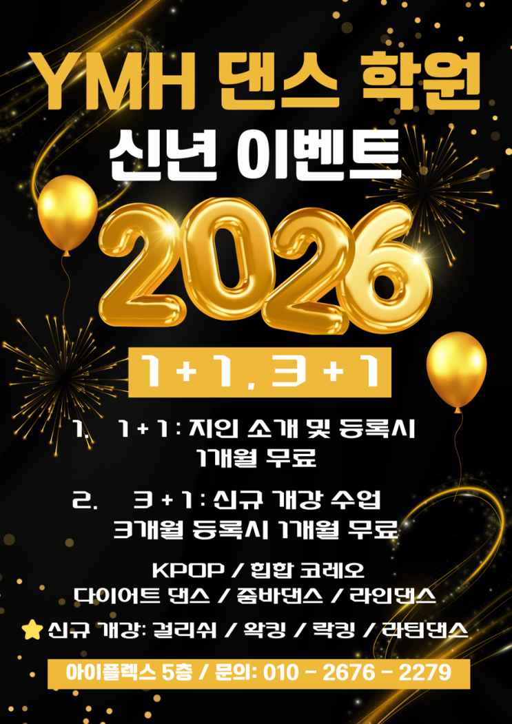 YMH 댄스학원 2026 신년 이벤트 안내 안녕하세요, YMH 댄스스튜디오입니다 이제 곧 연말이 다가오고 있네요! 2025년 새해가 엊그제 같은데 벌써 2026년 새해가 밝아오고 있습니다 ㅎㅎ YMH 댄스학원에서도 2026년을 맞아 신년 맞이 특별 이벤트를 진행합니다! 새해에는 건강도, 취미도, 자신감도 댄스로 한 번에 잡아보세요 ✨ 2026 신년 이벤트 혜택 ① 1 + 1 이벤트 지인 소개 후 함께 등록 시 ✔️ 1개월 수강 무료 ② 3 + 1 이벤트 신규 개강 수업 3개월 등록 시 ✔️ 1개월 수강 무료 ※ 이벤트 혜택은 기간 한정으로 진행됩니다. YMH 댄스학원 수업 안내 ✔️ K-POP ✔️ 힙합 코레오 ✔️ 다....... <img src="https://blogthumb.pstatic.net/MjAyNTEyMTNfMTk3/MDAxNzY1NjE4OTIzMDA5.sFEF3SfSqY3T0cGq4qjYwUNRAo1d95IzZK9v8dZG3HAg.OACqZ5-GZJHWe5i3FZM6tsDie6hwT1VbmnmRFbcH1a0g.PNG/IMG%A3%DF3445.PNG?type=s3" />