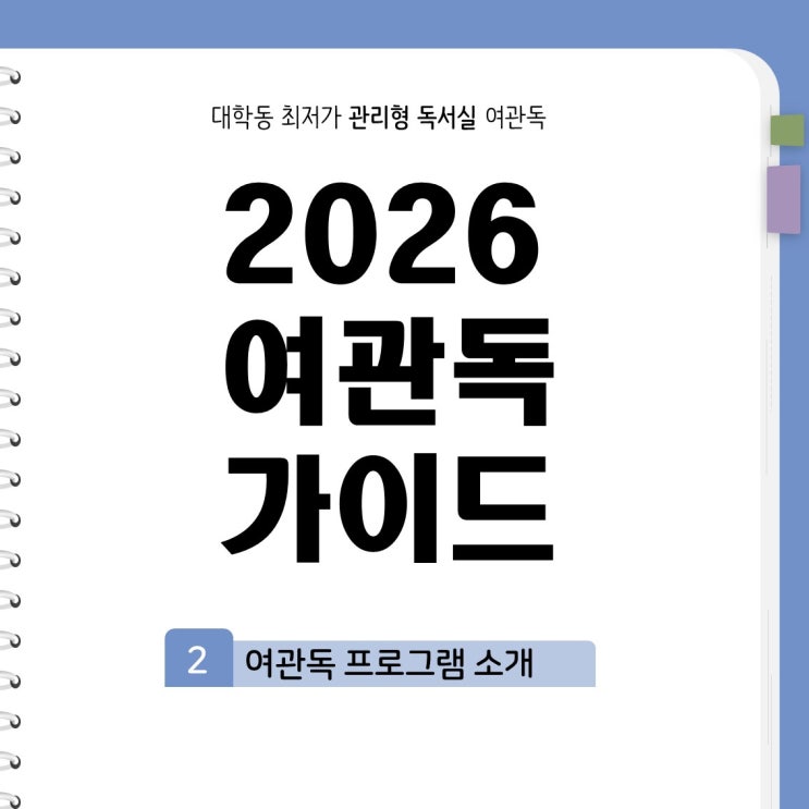 안녕하세요. #서울관리형독서실 #관리형독서실 #대학동독서실 #여기는관리형독서실 #대학동여관독 입니다. 이번 포스팅은 [2026 여관독 가이드] 총 4편 중 2편으로 여관독 프로그램을 자세히 소개해드리겠습니다. 2026 여관독 가이드 구성 1편 — 관리형 시스템 : 2026년형 여관독의 큰 틀인 시스템을 자세히 다룹니다. 2편 — 여관독 프로그램 소개 : 수험생 맞춤형 학습 프로그램을 자세히 소개합니다. 3편 — 여관독 시설 소개 : 더 편안하고 집중력 높은 학습 환경을 위한 업그레이드 포인트를 알려드립니다. 4편 — 할인 및 이벤트 소개 : 2026년 대비 수험생을 위한 할인 혜택, 진행중인 프로모션 등 정보를 모아 알려드립니다. 여관....... <img src="https://blogthumb.pstatic.net/MjAyNTEyMDhfODAg/MDAxNzY1MTU0MDk1NTY4.FrVDGcOXnSy0ummJni-BfAeSCNhOoQ8l4nW_RVy0Ftkg.aePqfKKXYhkjM-fFMhsiINRzQa_Juv9BwE1V7vkl1QEg.JPEG/%BD%BD%B6%F3%C0%CC%B5%E51.JPG?type=s3" />