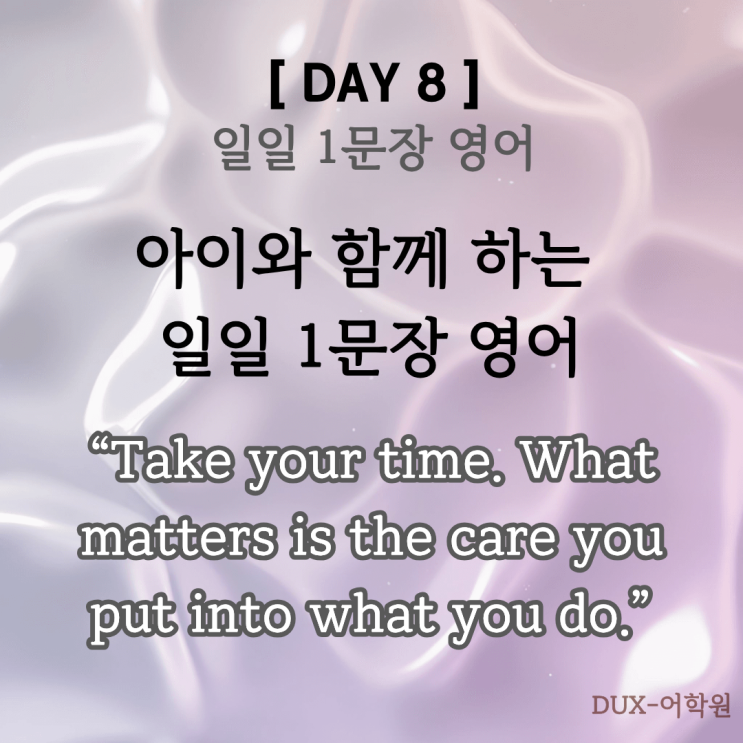 아이에게 가장 필요한 힘은 ‘잘해야 한다’는 부담보다, 조금 느려도 차근차근 해낼 수 있다는 확신입니다. 오늘은 아이의 집중력과 꾸준함을 응원해주는 문장을 준비했습니다. < Today’s Sentence > “Take your time. What matters is the care you put into what you do.” → 천천히 해도 돼. 중요한 건 네가 얼마나 정성을 다하는지야. 결과보다 과정 그 자체를 인정해주는 문장으로, 아이의 성취감과 집중력을 자연스럽게 길러줍니다. < 문장 포인트 > Take your time → 서두르지 않아도 된다는 안정감 전달 → 아이가 압박감 없이 자기 속도를 지키게 도움 What matters is the care you put into what you do → 노력 + 성....... <img src="https://blogthumb.pstatic.net/MjAyNTEyMTJfMjU2/MDAxNzY1NTM4MjQ3NjA5.h_QA-XjXPHpkQLCAf4oRZS9GHz-3Z4m4QAn2d8lkRUIg.dj7SmOQxABdx_PX1ndlFMIFTKgml7nxJ720KWEKjB5Mg.PNG/40.png?type=s3" />