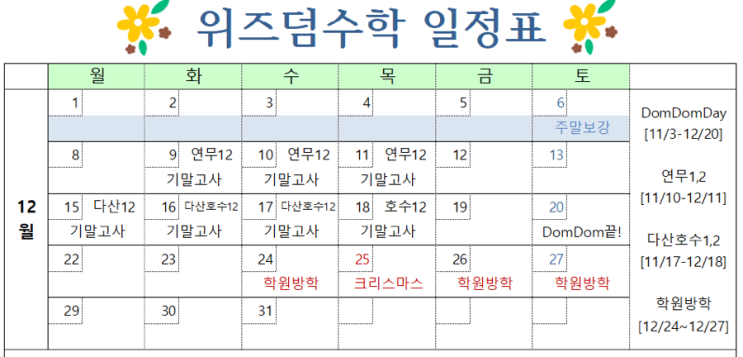 12월 리드인 수업 일정과 기념일 안내입니다