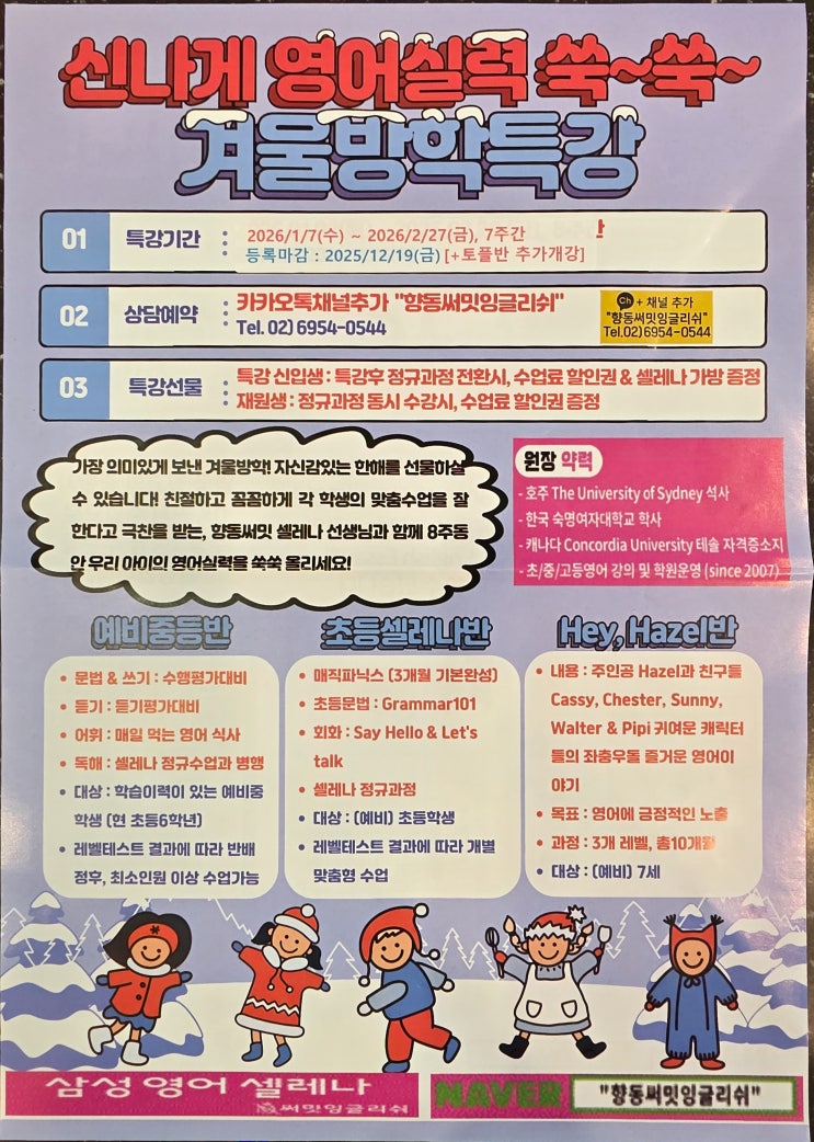 ❤️겨울방학 특강 안내❤️삼성영어셀레나 향동써밋잉글리쉬학원