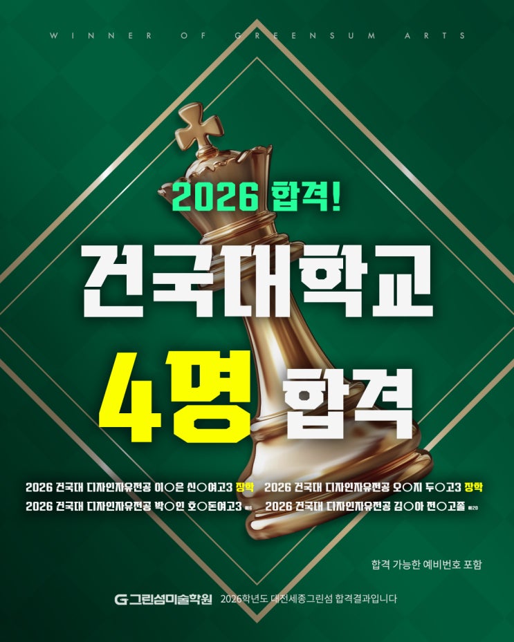 [2026 수시 대박] 건국대학교 4명 합격! 18개월의 기적부터 장학생까지 압도적 결과로 증명 (예비반 필독! 전형 분석 및 합격 전략 공개) 이번 2026학년도 입시에서 저희 학원 학생 4명이 건국대학교 글로컬캠퍼스에 합격하게 되었습니다. 그중 2명은 장학생으로 선발되었고 건국대·남서울대·한남대 모두를 장학생으로 합격했으며 실기 경력 1년 6개월 만에 동덕여대와 건국대를 동시 석권했습니다. 저마다의 드라마가 가득한 지금 단순한 합격 소식을 넘어 어떻게 불안함을 이겨내고 좁은 문을 통과 하였는지 비결을 나눠 봅시다. 1. 대전·세종·충청권 학생을 위한 합격 전략: 건국대 글로컬 지역인재 전형 건국대학교 글로컬캠퍼스는 충청권 학....... <img src="https://blogthumb.pstatic.net/MjAyNTEyMTJfMTYg/MDAxNzY1NTM2NDYyNzk2.EwdTunXUxKmYfQLOThdL9Uh5C4b6iFmGxMt_O8HHO9gg.c9q1mi0ktja4-UAqnsy0m5WQkLyPMJ8jFd2drZWQ3cAg.JPEG/%B0%C7%B1%B9%B4%EB_4%B8%ED.jpg?type=s3" />