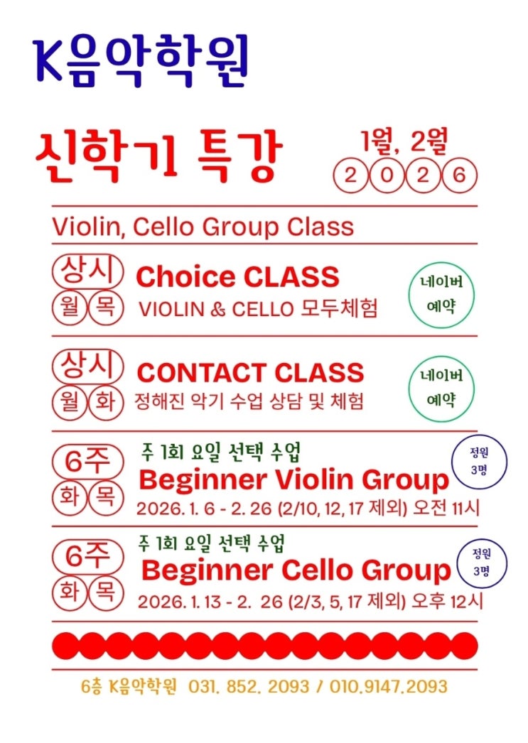바이올린 첼로 클래스 신학기 특강 진행합니다. *문의 031. 852. 2093 * #의정부현악학원 #의정부첼로 #의정부바이올린 #방학특강 #민락동음악학원 #의정부민락동 #사립초바이올린 #신학기특강 #송산초등학교 #민락초등학교 #k음악학원 #한신초등학교 #동북초등학교 #청원초등학교 #상명초등학교 #악기체험 #악기상담 #바이올린체험 #바이올린상담 #첼로체험 #첼로상담 <img src="https://blogthumb.pstatic.net/MjAyNTExMjFfMzIg/MDAxNzYzNjg5NzQxNDU2.awqKnCChpY1YGExYdbd7jmlEoZGBP7KAiQb1P924kMsg.v-mWG7uKJlM2Ytk2bI2qoBMfdYhO3XzWiDmDJn3pNgYg.JPEG/900%A3%DF1763689740831.jpg?type=s3" />