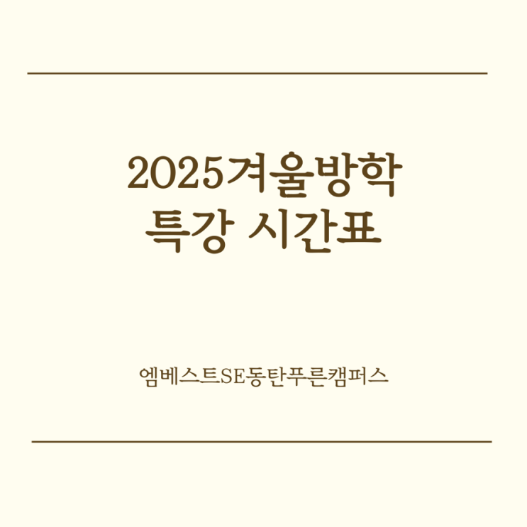 안녕하세요. 엠베스트SE 동탄푸른캠퍼스 원장입니다 아이들의 2학기가 마무리되어가고, 이제 본격적인 겨울방학 학습 플랜을 세우셔야 하는 시기입니다. 겨울방학은 한 해의 학습을 정리하고, 다음 학년을 위한 기초를 가장 안정적으로 다질 수 있는 골든타임입니다. 특히 이번 겨울은 새 교육 과정 대비, 내신 변화, 수행 강화 등 중요한 변화가 많은 만큼 준비가 더 필요합니다. 그래서 우리 학원에서는 초·중·고 전 학년 대상 겨울방학 특강을 아래와 같이 운영합니다. 초등부 겨울방학 특강 ✔ English Musical + English Diary (월~목) 창의적 표현 + 스피킹 기반 영어 자신감 UP 정원 4명 소수 진행 ✔ 초등 수학선행 1월 / 2월....... <img src="https://blogthumb.pstatic.net/MjAyNTEyMDVfMjE3/MDAxNzY0OTIyMzczMTc0.O5qGqI5vBA9hMCc6LGGBwq_uPlod8dHnZ9np4iTeVNkg.qQaaoOWa-4WhcSnFgXQkRpEeifayITUphXjDYQhWt8og.PNG/%C1%A6%B8%F1%C0%BB%A3%AD%C0%D4%B7%C2%C7%D8%C1%D6%BC%BC%BF%E4%A3%DF%A3%AD001%A3%A86%A3%A9.png?type=s3" />