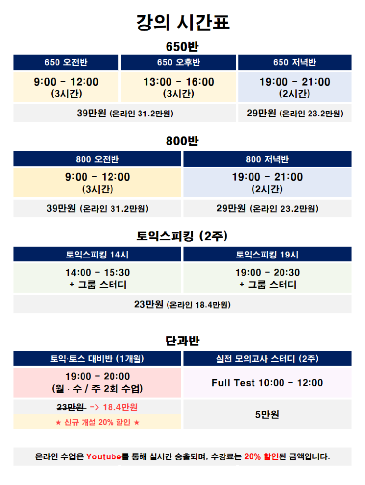 안녕하세요, 토익트레이너입니다! ✔2025년 1월 수강안내 ☃ 2026년 1월 접수는 "12월 15일 (월)" 부터 입니다 :) 아래 정보 잘 확인하시고 궁금한 사항이 있으시면 언제든지 편하게 문의주세요. 데스크 운영시간 참고부탁드립니다 [월~목 : 12:00~21:00 ] 금, 토, 일요일, 공휴일은 전화문의 언제나 가능합니다. ☎ 052)225-1452 1월 강의 시간표 1월 토익 일정표 ✔ 1월 토익 수업 일정은 개강 - 1/5 (월) 종강 - 1/29 (목) 모의고사 - 1/16 (금) 입니다 :) 1월 토스 일정표 ✔ 1월 토익스피킹 수업 일정은 1차 수업 개강 - 1/5 (월) 1차 수업 종강 - 1/15 (목) 온라인(웨일온) 특강 - 1/9 (금) 온라인(웨....... <img src="https://blogthumb.pstatic.net/MjAyNTEyMTFfMTUy/MDAxNzY1NDMzMTIzMjYx.D_w4gwtM1T7IRVXL2ooD2BwcpVUZllbR8-Up_EhPAFAg.JGqm_W7qJslpB8R0TZ0-g_0310jDQb93agzooh3HnWkg.PNG/1._1%BF%F9_%B0%AD%C0%C7%BD%C3%B0%A3%C7%A5.png?type=s3" />