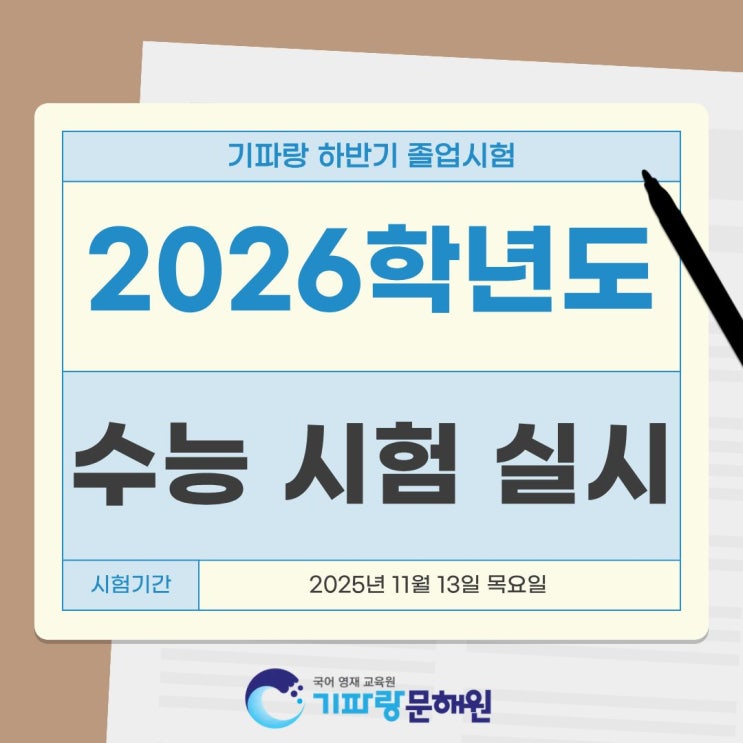 안녕하세요. 대연동 국어학원 기파랑문해원 부산남천원입니다. 2025년을 마무리하는 시기가 어느새 성큼 다가왔습니다. 올해를 끝맺으며 알찬 한해라는 생각이 많이 드는 요즘입니다. 기파랑 친구들도 학기를 마치며 그런 생각을 하기를 바랍니다. 정확히 한 달 전, 11월 13일 대학수학능력시험이 있었죠. 수험생을 포함한 많은 학생들이 긴장 속에서 수능일을 지나왔으리라 생각합니다. 우리 기파랑문해원 남천원에서도 같은 날, 기파랑 하반기 졸업반 학생들을 대상으로 한 2026학년도 수능 시험이 실시되었습니다! 기파랑문해원 부산남천원 2025년 하반기 졸업 시험은 기파랑반 1년 과정을 모두 마무리한 학생들을 대상으로 진행되었습니다. 6....... <img src="https://blogthumb.pstatic.net/MjAyNTEyMTNfMjg1/MDAxNzY1NjAwMjI3NzA2.WQkCwhUfZuJpT1GBrJ6A45GuTBtGzHWXBO_tknE6KU0g.8JTRDPXO5AuR08dTmD8GLCr5YTIGk1a3_Hq-P4oMfW0g.JPEG/1.jpg?type=s3" />
